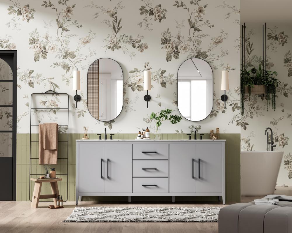 The minimalist flat door panels create a sleek, modern appearance, perfect for blending into transitional and contemporary bathroom designs.