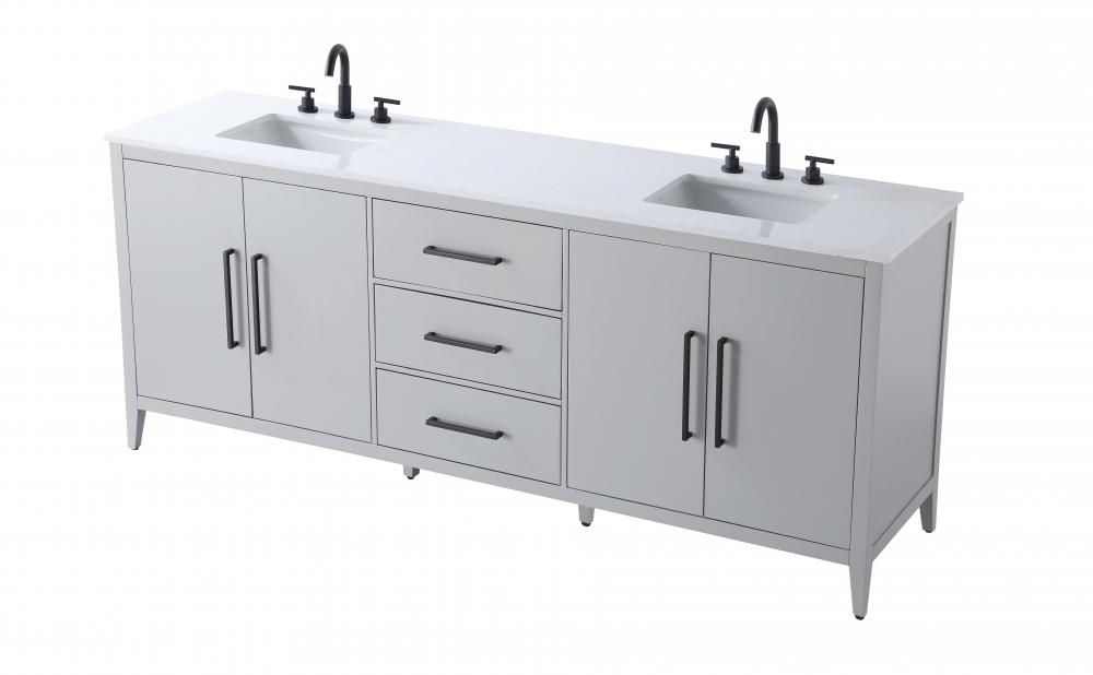 The vanity stands on tapered 5-inch solid wood legs with levelers for a balanced, polished look, combining modern style with practicality.