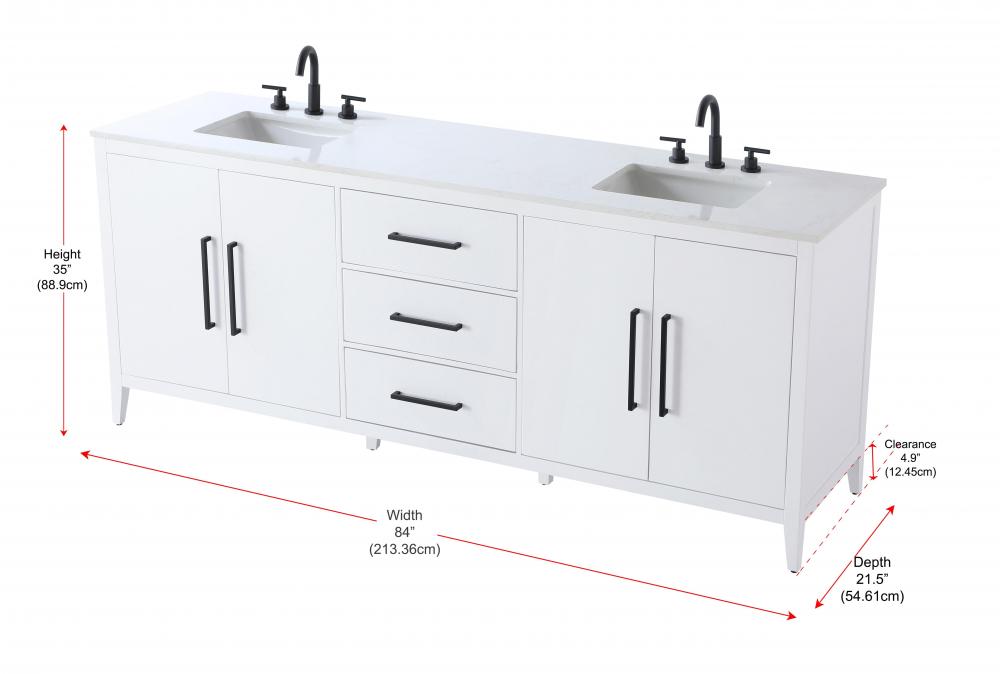 The vanity stands on tapered 5-inch solid wood legs with levelers for a balanced, polished look, combining modern style with practicality.