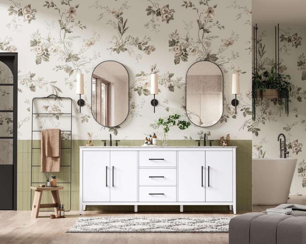 The minimalist flat door panels create a sleek, modern appearance, perfect for blending into transitional and contemporary bathroom designs.