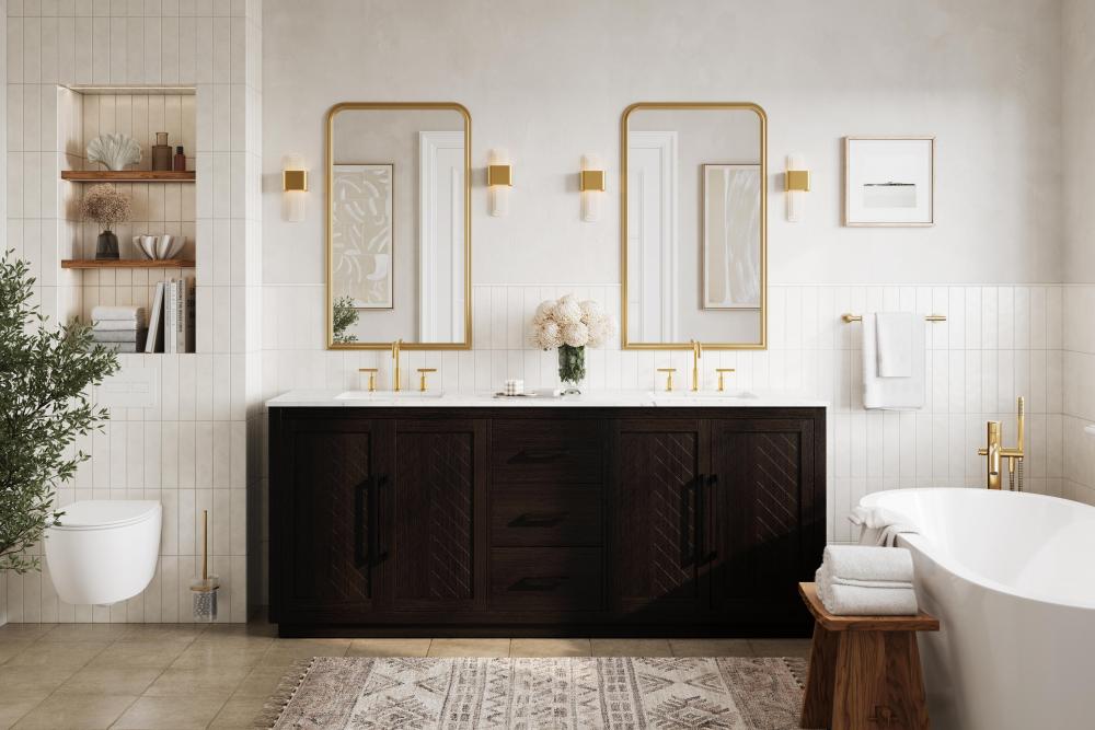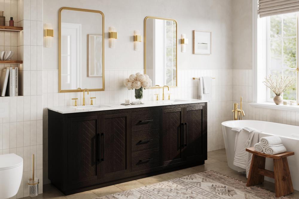 Each finish enhances the unique herringbone design on the Shaker-style door panels, adding a touch of craftsmanship and texture that elevates the overall design of the vanity.