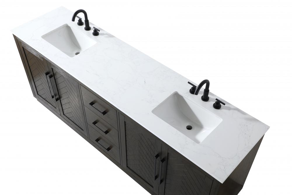 This transitional bathroom vanity offers the perfect blend of timeless style and modern functionality. Available in five refined finishes—crisp white, sleek grey, chocolate oak, honey oak, and linen oak—it complements a range of decor styles, from classic to contemporary. The stunning herringbone design on the Shaker-style door panels adds texture and craftsmanship to the piece. Topped with a white engineered marble countertop featuring subtle veining, it provides both beauty and durability. The long black metal pulls on the soft-closing doors and the thin bar pulls on the drawers add sleek, modern detailing. Practical features include a concealed overflow, a back panel cutout for easy plumbing installation, and a U-shaped cutout shelf to fit plumbing while maximizing storage space. with a toe kick all around the base, this vanity is thoughtfully designed to blend form and function in any bathroom setting.