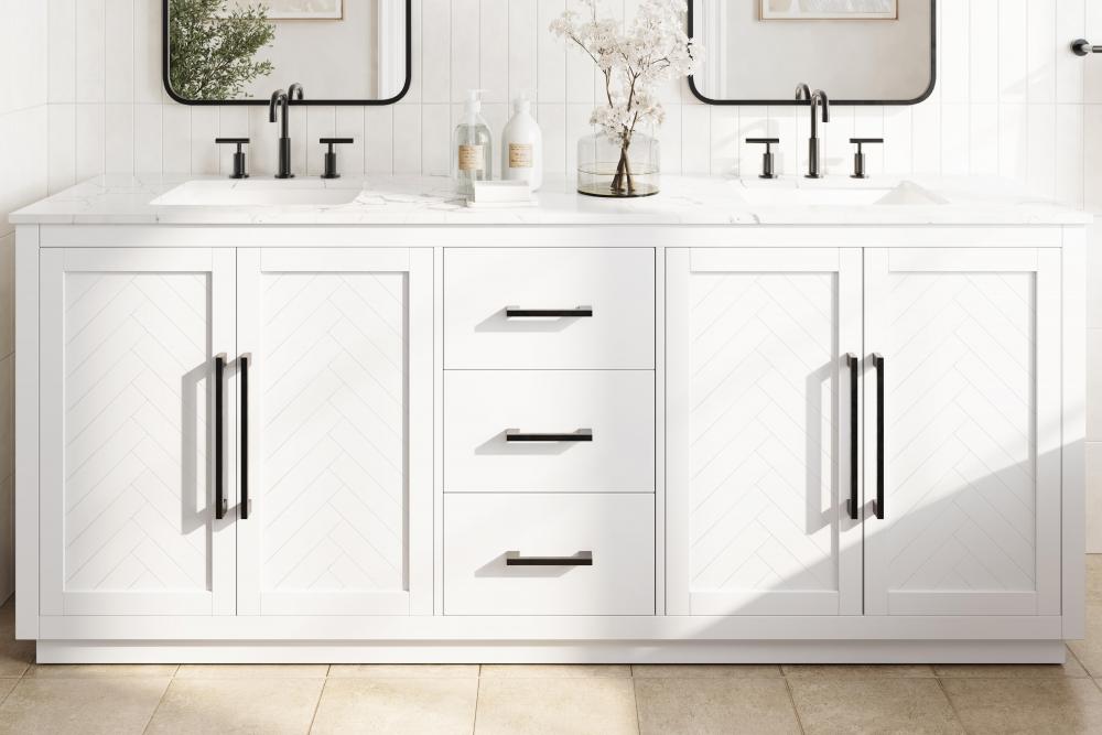 Each finish enhances the unique herringbone design on the Shaker-style door panels, adding a touch of craftsmanship and texture that elevates the overall design of the vanity.