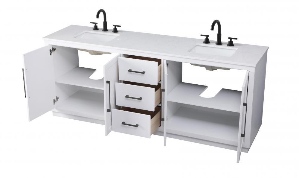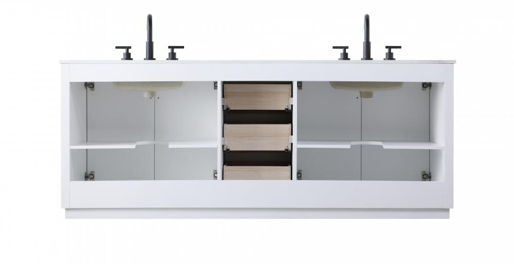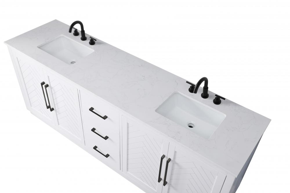 The vanity is topped with a white engineered marble countertop featuring subtle, natural-looking veining that creates a luxurious yet low-maintenance surface. This countertop adds elegance while providing durability, making it ideal for everyday use.