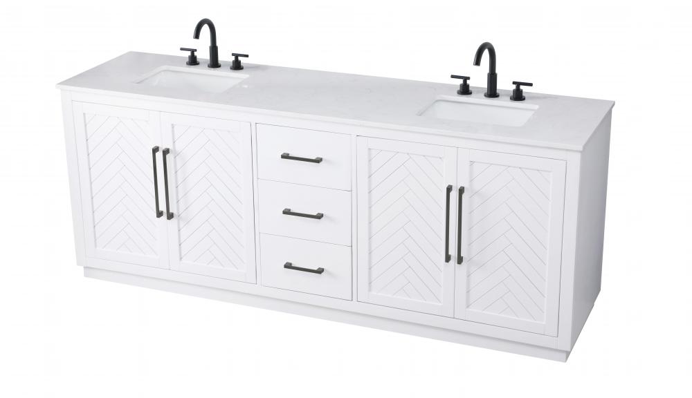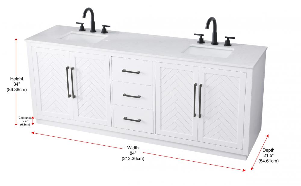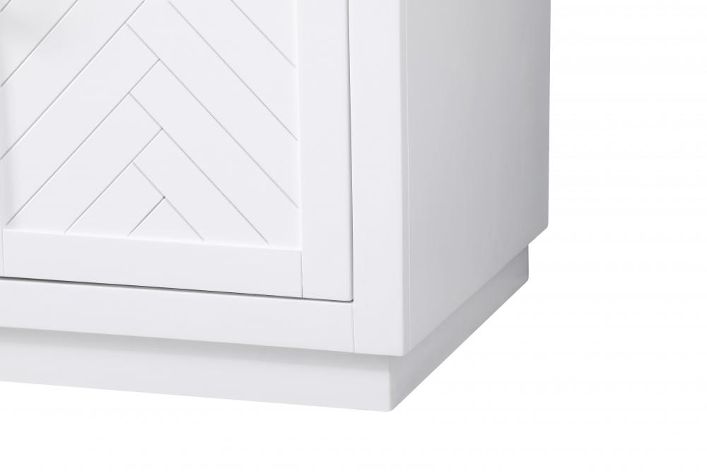 This transitional bathroom vanity offers the perfect blend of timeless style and modern functionality. Available in five refined finishes—crisp white, sleek grey, chocolate oak, honey oak, and linen oak—it complements a range of decor styles, from classic to contemporary. The stunning herringbone design on the Shaker-style door panels adds texture and craftsmanship to the piece. Topped with a white engineered marble countertop featuring subtle veining, it provides both beauty and durability. The long black metal pulls on the soft-closing doors and the thin bar pulls on the drawers add sleek, modern detailing. Practical features include a concealed overflow, a back panel cutout for easy plumbing installation, and a U-shaped cutout shelf to fit plumbing while maximizing storage space. with a toe kick all around the base, this vanity is thoughtfully designed to blend form and function in any bathroom setting.