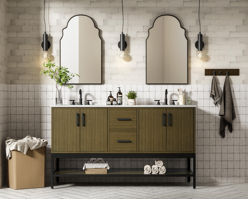 Upgrade your bathroom with this modern bathroom vanity that combines form and function effortlessly. Its sleek wood veneer cabinetry, paired with a bold black metal frame, brings a clean, contemporary vibe to any space. Designed with practicality in mind, this vanity offers soft-close drawers and cabinets to organize your essentials, as well as an open lower shelf for added storage or display. The durable white quartz countertop is built to withstand daily use, while the undermount ceramic sink ensures easy maintenance. Complete with matte black hardware and pre-drilled features for effortless installation, this vanity is the perfect centerpiece to refresh your bathroom with style and efficiency.