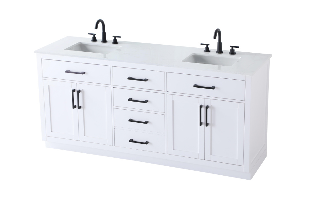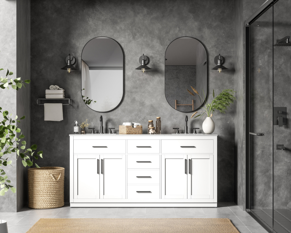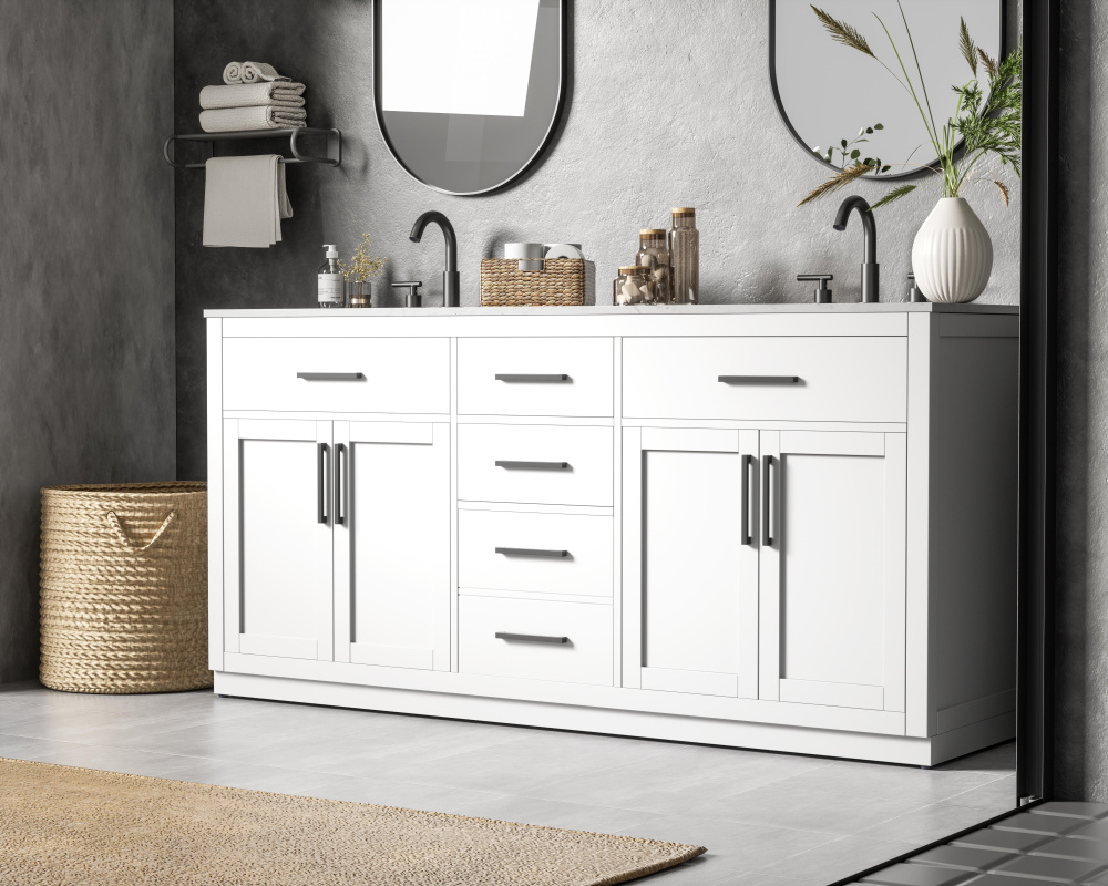 Introduce a perfect balance of functionality and style to your bathroom with this thoughtfully designed vanity. Constructed with a combination of solid wood and MDF, it offers durability and a sturdy build. The sleek engineered marble countertop with subtle grey marbling complements the rustic wood grain finish, creating a stylish and inviting centerpiece for your bathroom. Designed in a contemporary style with a transitional flair, it features a U-shaped shelf for seamless plumbing integration and multiple soft-close drawers for clutter-free organization. A pull-down drawer enhances convenience, while the toe kick adds a refined, clean-lined appearance and simplifies cleaning underneath. Matte black hardware contrasts beautifully with the cabinet finish, tying the look together. Delivered fully assembled and equipped with foot levelers, this vanity combines practicality and aesthetic appeal to suit modern and transitional bathrooms alike.