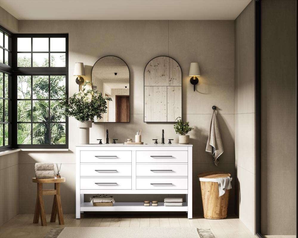 The open shelf at the base offers stylish and practical storage for towels and other bathroom essentials.