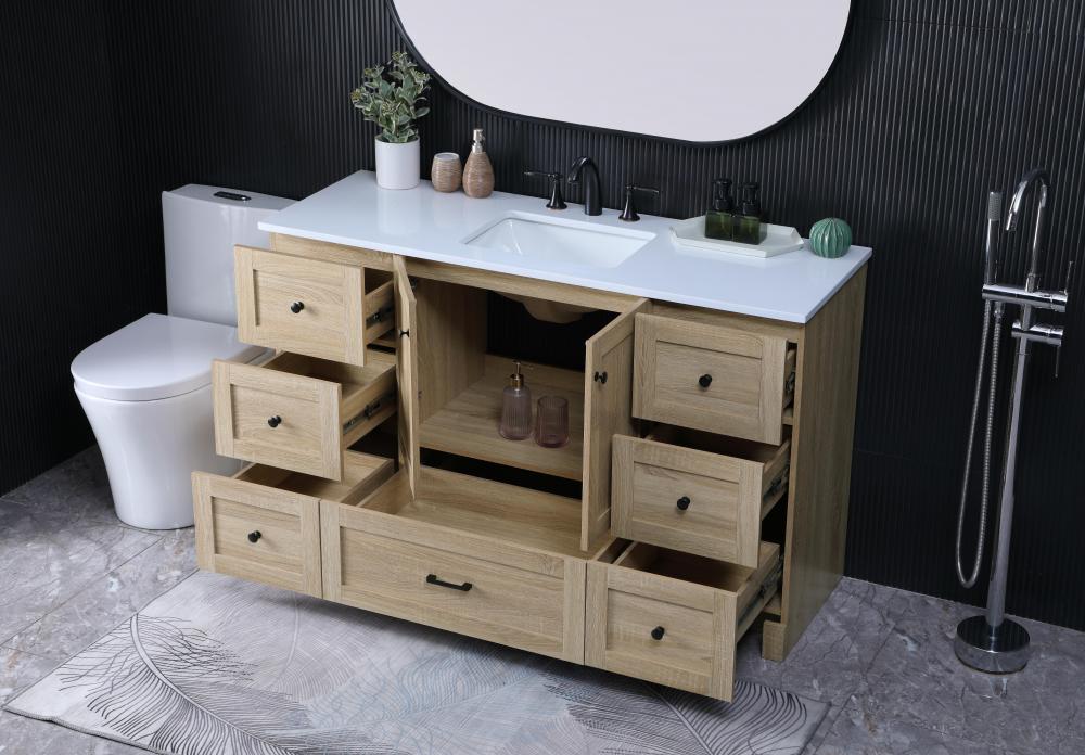 Experience the epitome of convenience with a freestanding vanity featuring an open back panel, making plumbing installation a breeze.