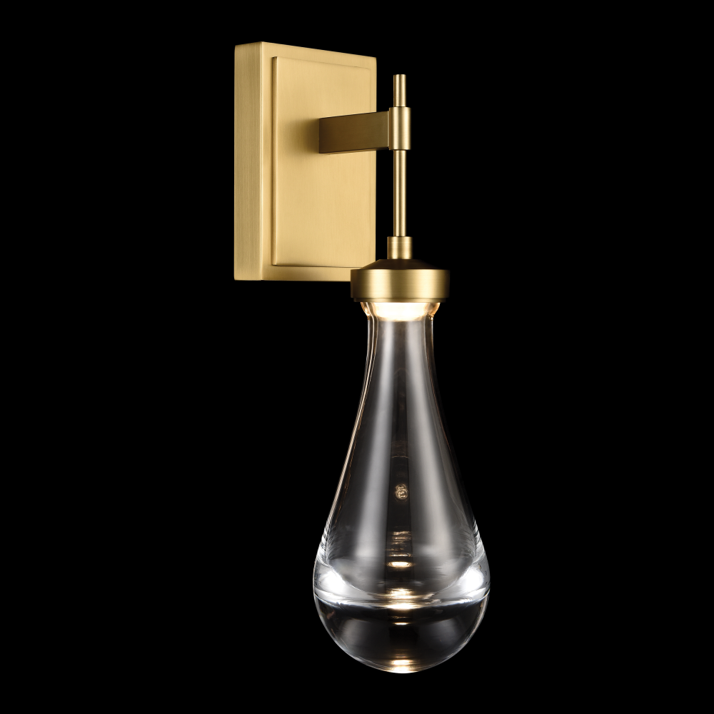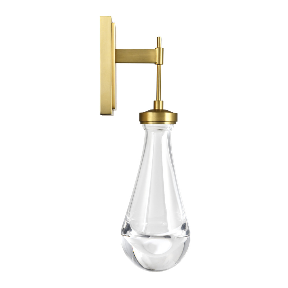 LED 5" Vertical Wall Sconce with solid heavy clear glass shaped as a rain drop. Refined metal details with our premium aged brass finish. Adjustable arms for unique designs and integrated Replaceable LED with 3CCT 3000K, 3500K and 4000K.