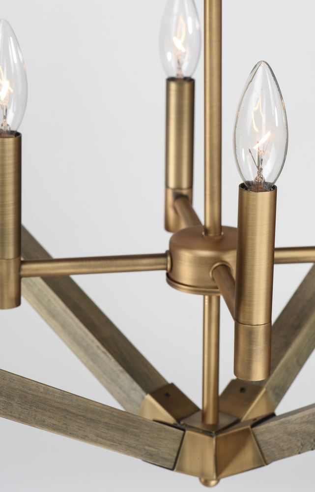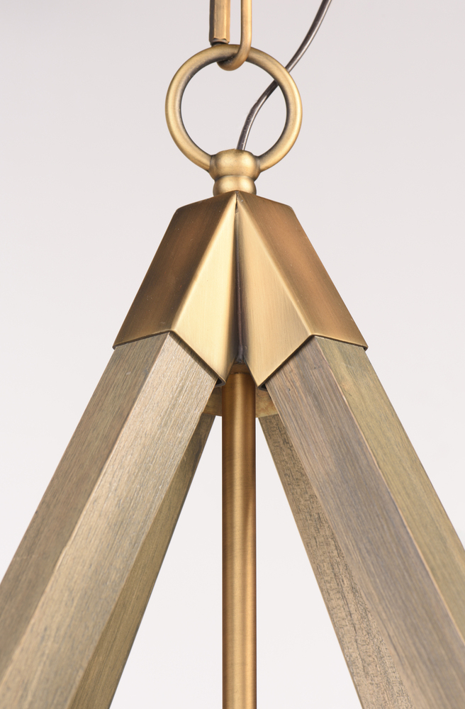 Prism shape pendants made of solid wood finished in Weathered Oak and trimmed with Antique Brass accents work beautifully over kitchen islands or dining tables. The contemporary shape and traditional finish demonstrate a transitional design that fits into