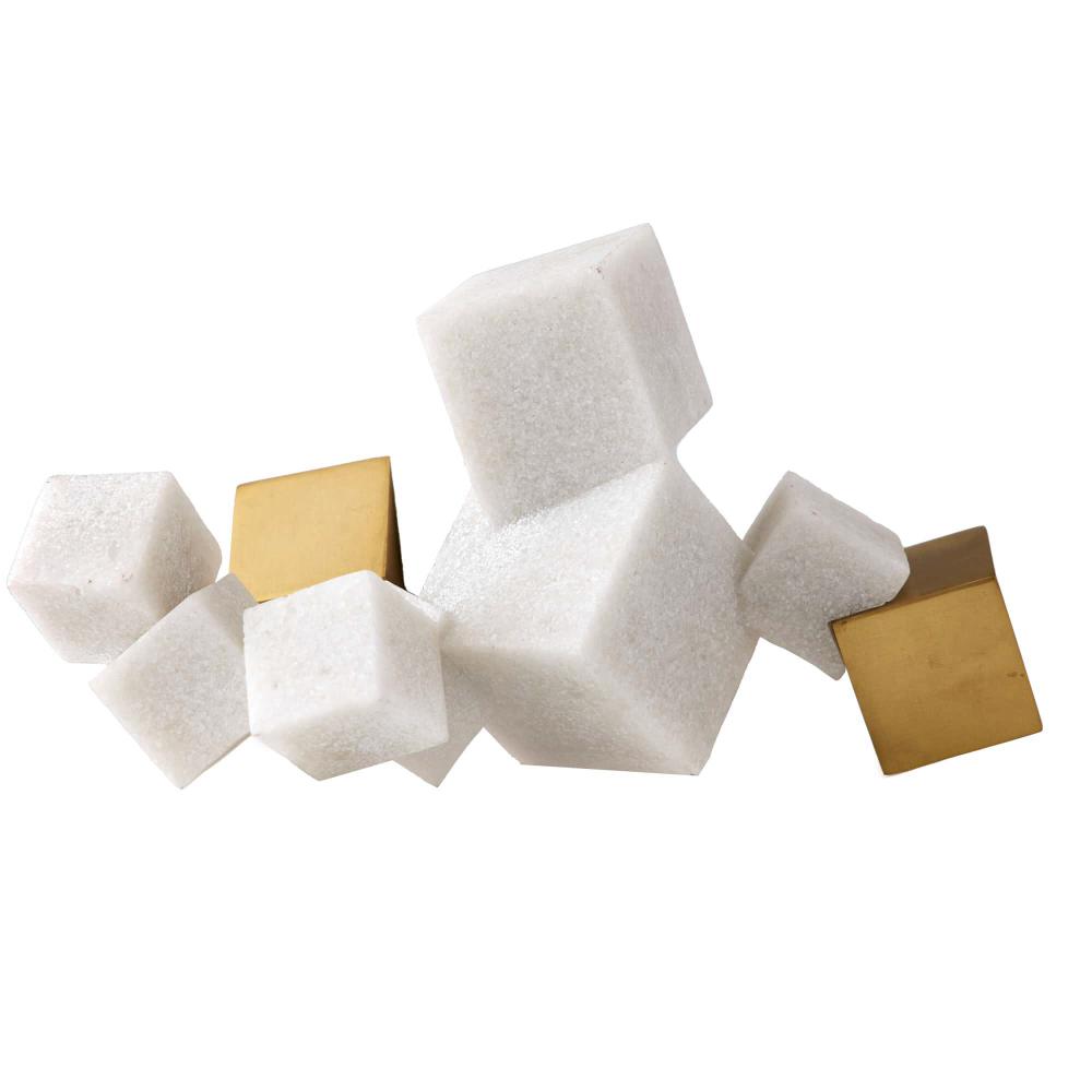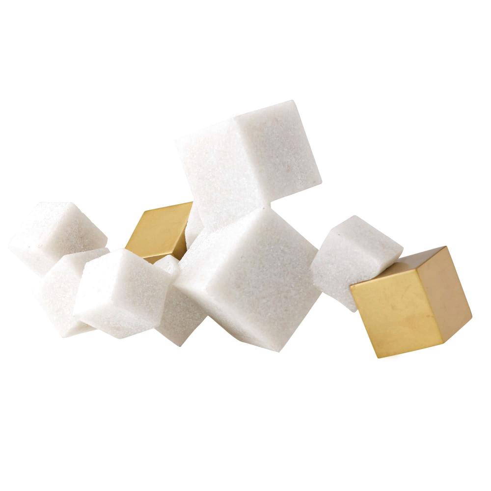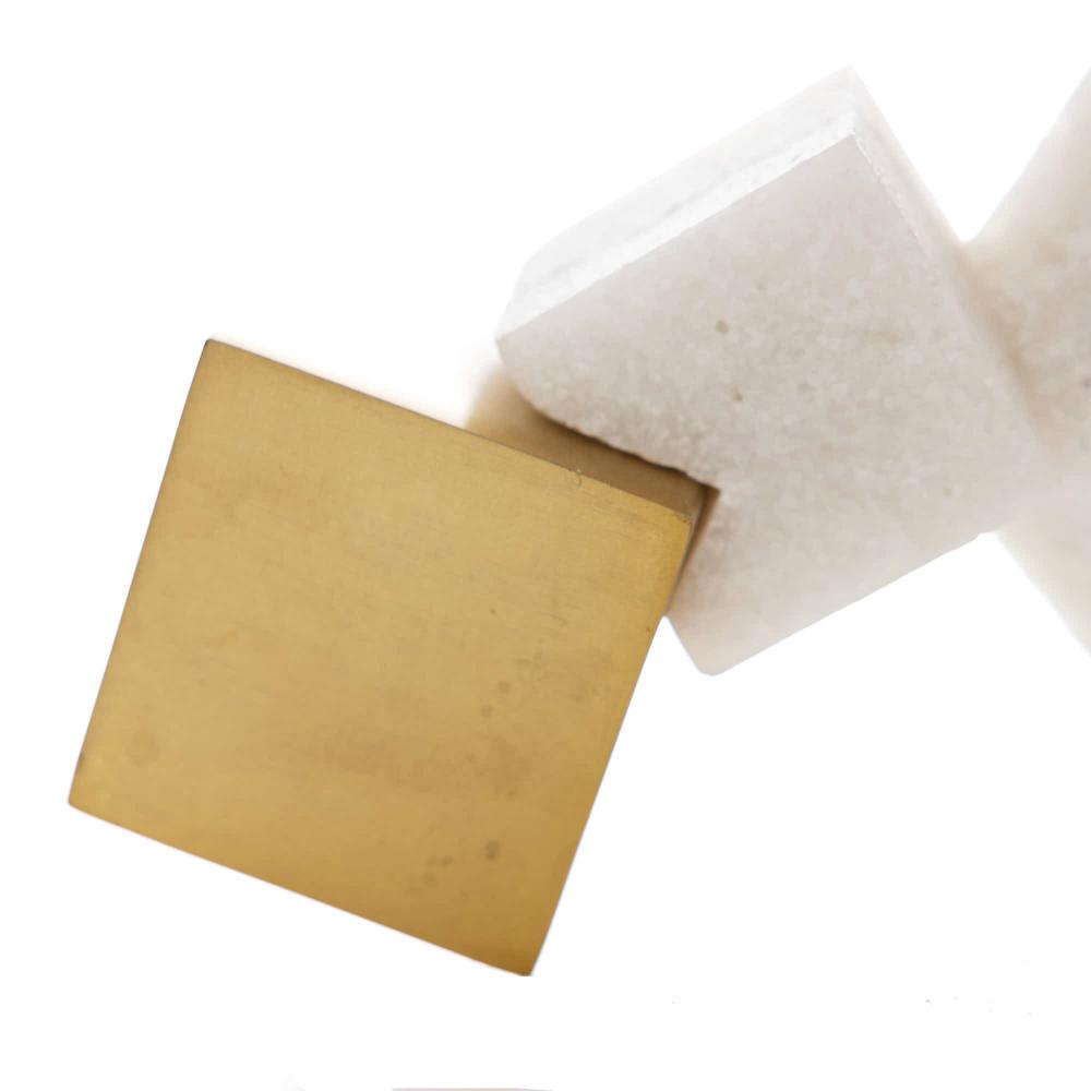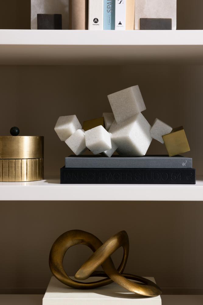 NATURE’S MOST PERFECTLY FORMED MINERAL, PYRITE, INFORMS THE DESIGN OF OUR VENETIAN SCULPTURE. THE CUBIC TABLETOP ART OBJECT MIMICS THE STUNNING CRYSTAL FORMATIONS, IN A HORIZONTAL COLLAGE OF RICESTONE COMPOSITE AND ANTIQUE BRASS FINISHED STEEL BLOCKS IN VARYING SIZES.