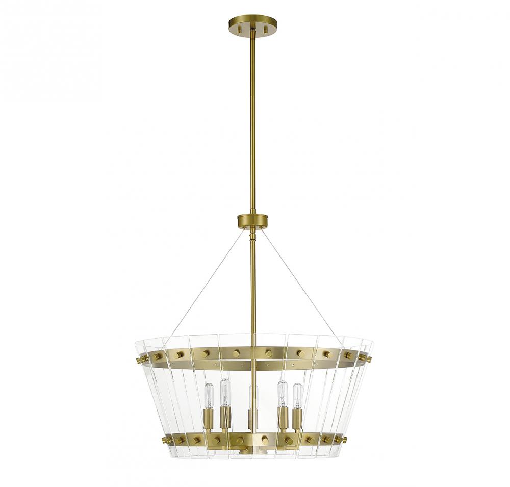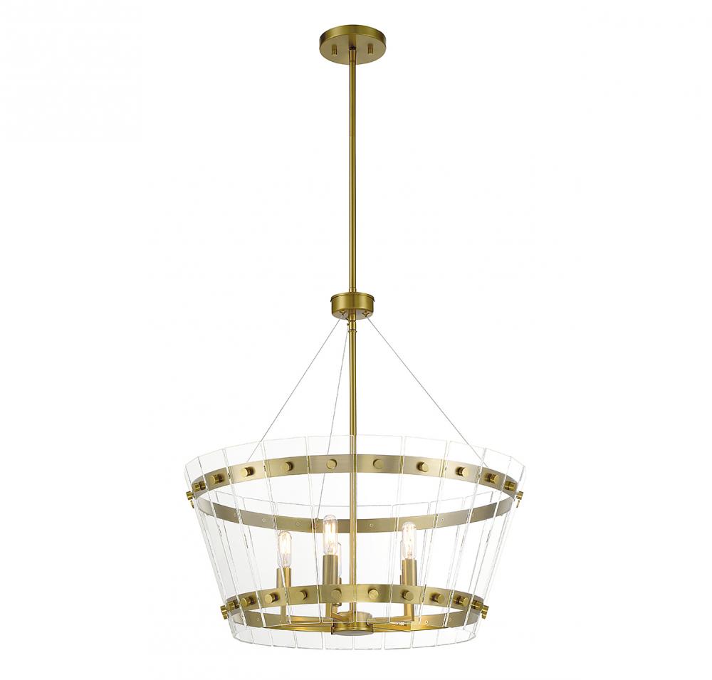 This Savoy House Ventari 5-light pendant is beautifully elegant in its simplicity. Its structure is adorned with slats of clear glass, finished in warm brass and appears to be suspended in midair. Ventari is 24" in width and has an adjustable height ranging from 25.5" to 79". Comes with four 12" downrods and one 6" downrod. It uses 5 candelabra size bulbs of up to 60 watts per bulb (bulbs not included).
