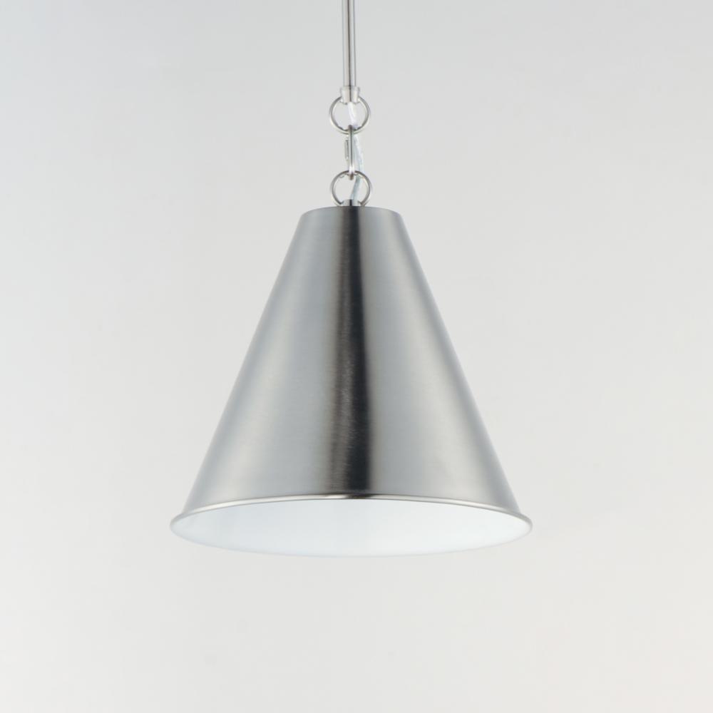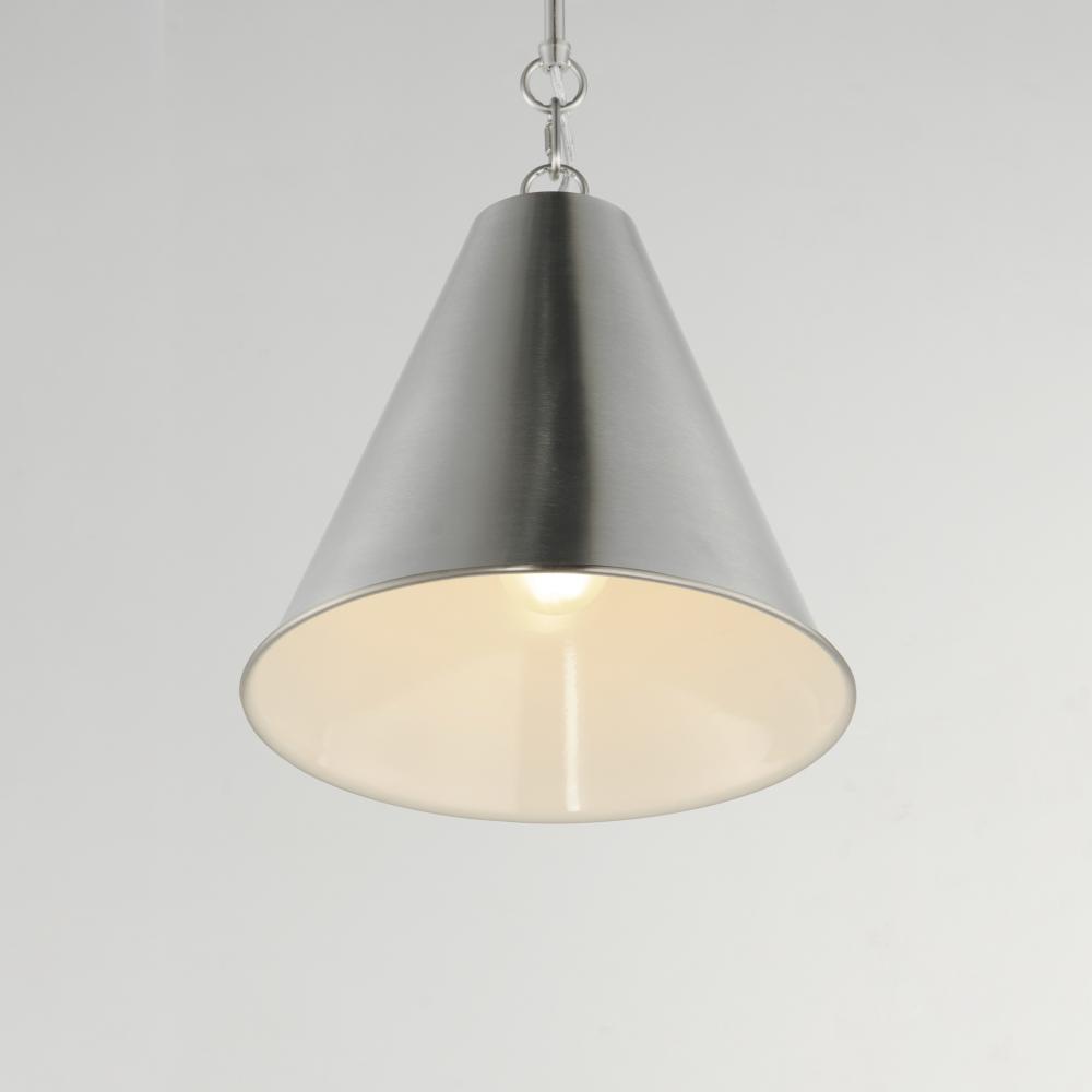 The iconic metal spun cone shade offers a transitional pendant design great as multiples over a kitchen island or dining table. Available in rich finishes including Heritage Brass, Satin Nickel, and Chestnut Bronze. All these shades are painted white on th