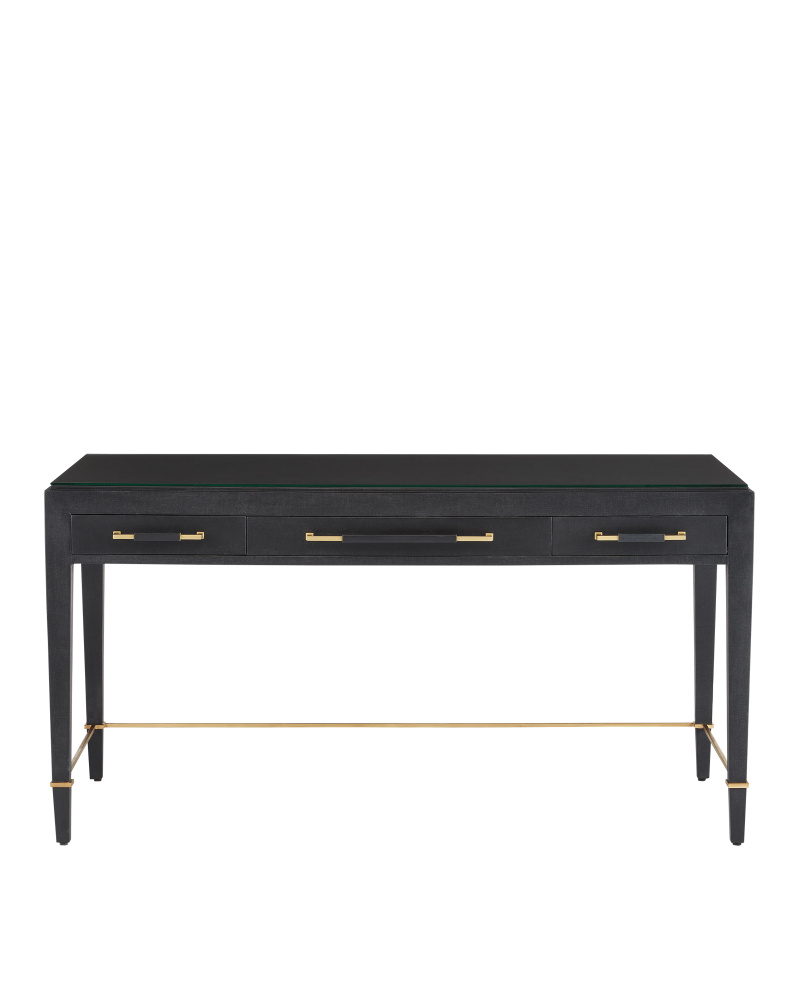 The Verona Black Large Desk is made of mahogany that has been covered in a black lacquered linen. It has a touch of gold on the champagne-finished metal detailing. This is one of our pieces that proves the brilliance of our design team, as the stretchers that clasp each leg are beautifully rendered to create a continuous design detail from leg to leg. Other features are adjustable glides and solid mahogany dovetail drawers.