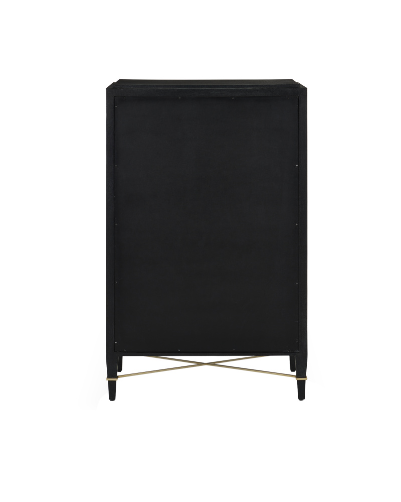 The Verona Black Five-Drawer Chest is darkly handsome covered in black lacquered linen with metal detailing in a champagne finish. The stretchers on this black chest create added interest to enhance its flair. The beautifully detailed drawer pulls, which are wrapped in matching material in the middle and left bare on each end, grace each drawer with their metallic sheen. This is a sophisticated touch, as are the squared edges of the hardware that match the straight-edges on the stretchers.