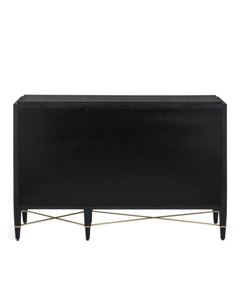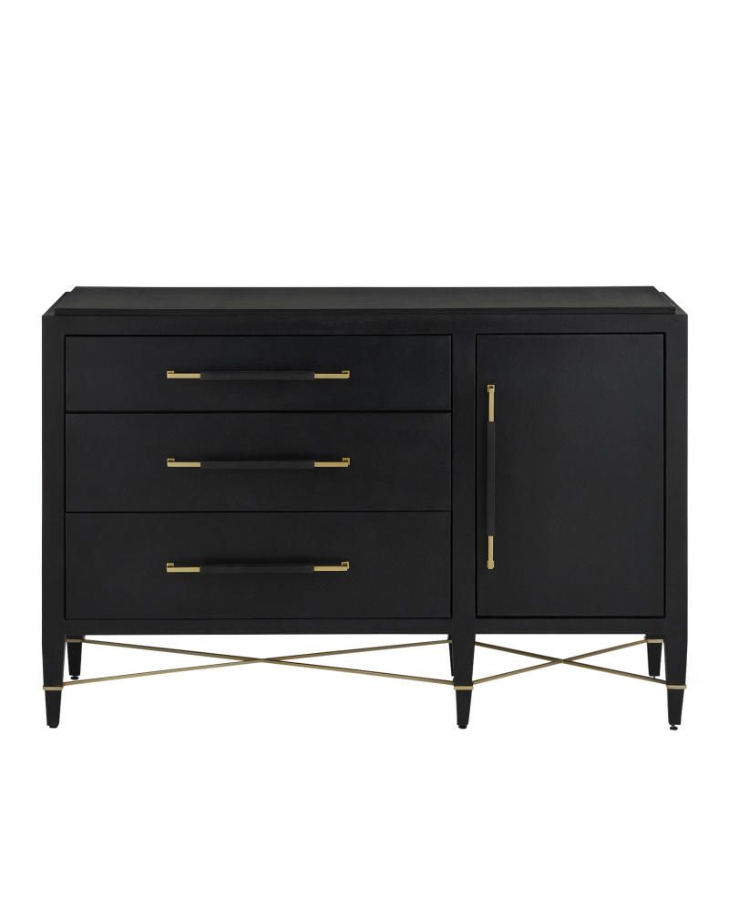 The Verona Black Three-Drawer Chest is darkly handsome covered in black lacquered linen with metal detailing in a champagne finish. The stretchers on this black chest create added interest to enhance its flair. The beautifully detailed drawer pulls, which are wrapped in matching material in the middle and left bare on each end, grace each drawer with their metallic sheen. This is a sophisticated touch, as are the squared edges of the hardware that match the straight-edges on the stretchers. The door with its single pull, which hides a two shelves and a drawer, is an elegant design move.