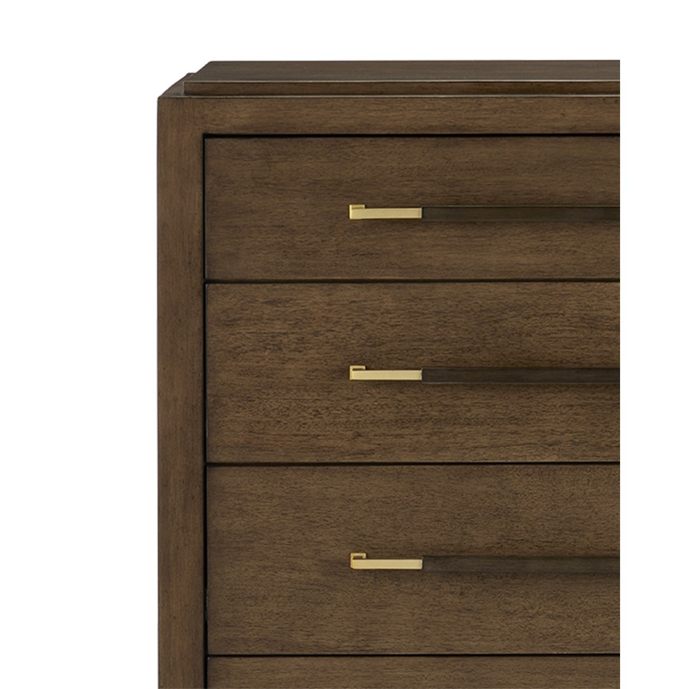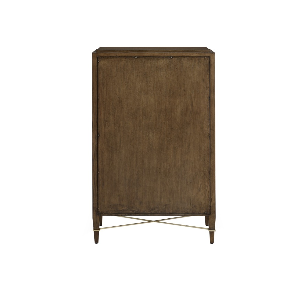 The Verona Chanterelle Five-Drawer Chest is warmly handsome covered in brown lacquered linen with metal detailing in a champagne finish. The stretchers on this brown chest create added interest to enhance its flair. The beautifully detailed drawer pulls, which are wrapped in matching material in the middle and left bare on each end, grace each drawer with their metallic sheen. This is a sophisticated touch, as are the squared edges of the hardware that match the straight-edges on the stretchers.