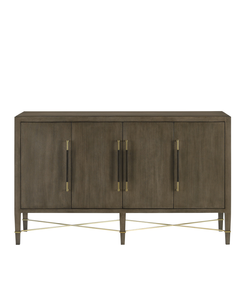 X marks the spot when the Verona Chanterelle Sideboard is introduced into a room. Made of mahogany that has been treated to a woodland-inspired chanterelle finish, it has been given a sexy touch of gold with the champagne-finished metal detailing. This is one of our pieces that proves the brilliance of our design team, as the stretchers that clasp each leg are so chicly rendered, they artfully meet at a crosshatch in the middle of the negative space. Design details include linen-wrapped metal handles, soft-close door hinges, six adjustable shelves, adjustable glides, cord management and an anti-tip kit. There are a number of pieces in several finishes in the Verona family of furnishings.