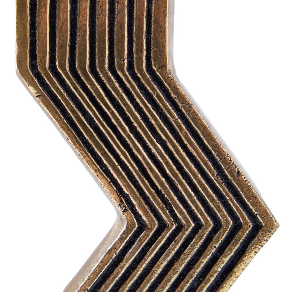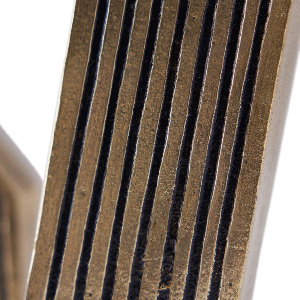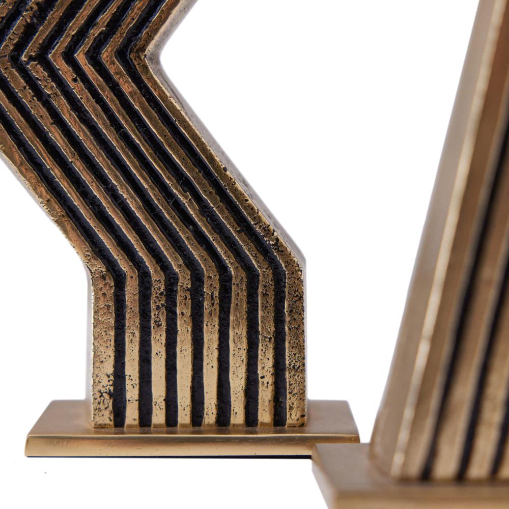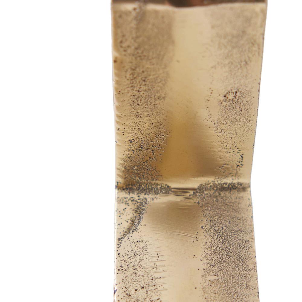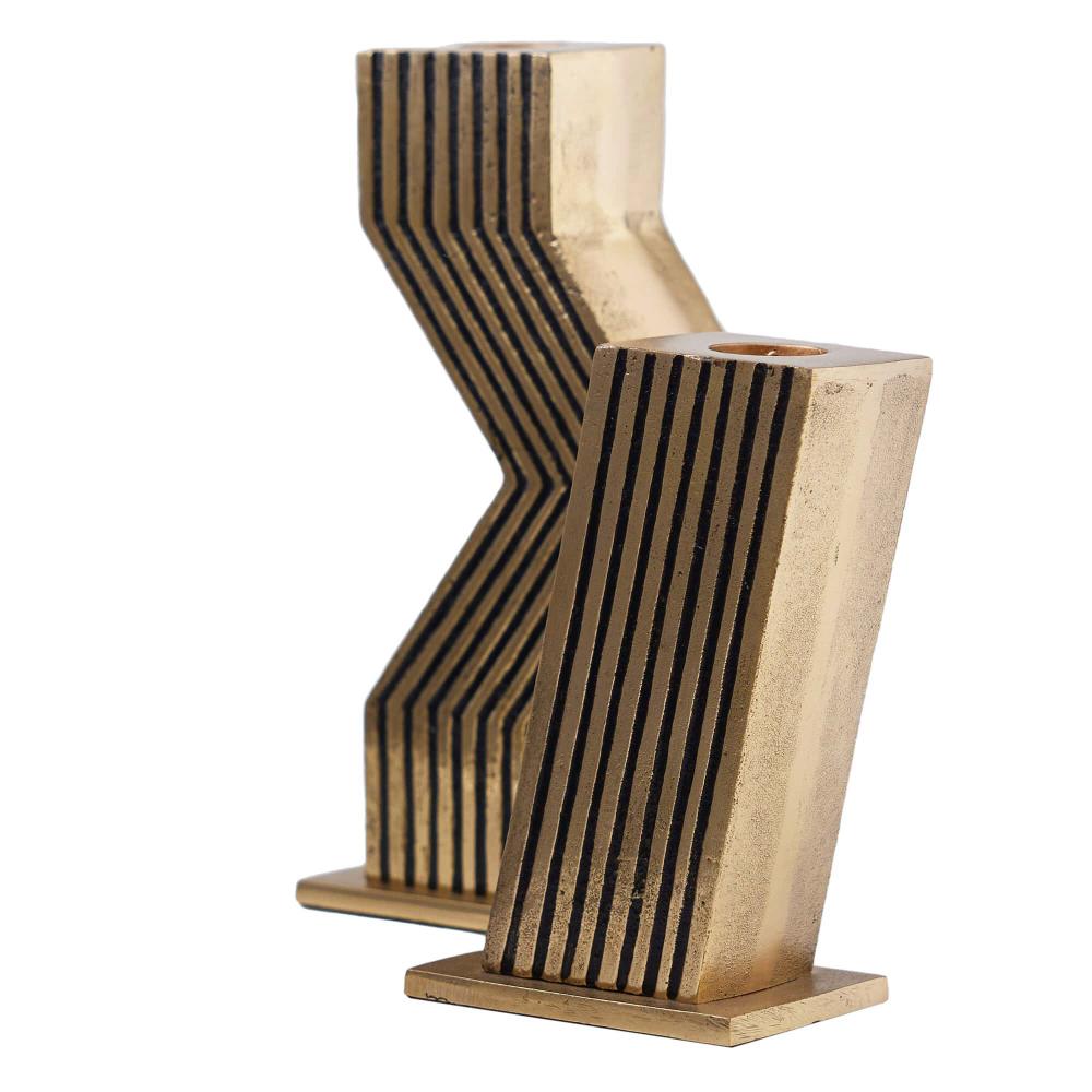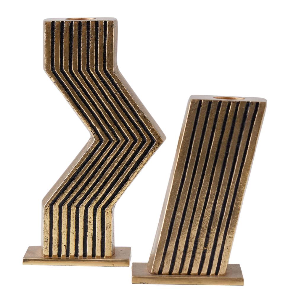 THIS EXPRESSIVE PAIR WAS DESIGNED WITH A MOD ’60S SENSIBILITY. RENDERED IN TWO SIZES AND FORMS, THE ANTIQUE CAST BRASS VESELY CANDLEHOLDERS FEATURE CARVED GROOVES THAT FOLLOW THE ANGULAR PROFILES. FINISH WILL VARY.