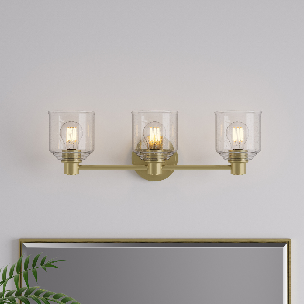 Retro-style seeded glass shades with tasteful fluted striping and flared edge imbue the Vessair Collection of bath lighting with vintage charm. Available as a 1-light sconce and 2 or 3-light vanity bar, these handsome fixtures are finished in either vintage brass or matte black and are set against a decorative round beveled backplate. Whether used as part of a traditional or eclectic interior design plan these lamps make the perfect statement.