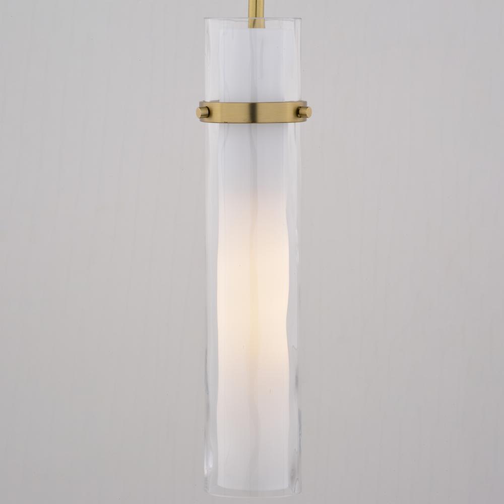 The Vilo collection is a perfect blending of simplicity and sophistication. Flat planes and bands of golden brass are a striking compliment to the more softly defined columns of water glass. Ample light emanates from the vertical glass shades creating a dramatic effect. These fixtures offer a classy touch to any contemporary space in your home. Install this mini pendant individually or in a group; ideal for kitchens, dining areas, or bar areas. Height is adjustable with the included down rods; compatible with sloped ceilings.