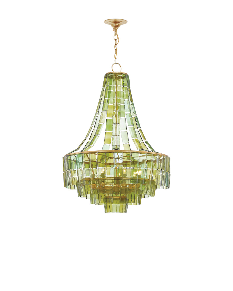 Each row cascading from the circular frames of the green version of our Vintner Chandelier is made up of individually-cut pieces of green glass made from recycled bottles, any number of which could have been at the scene of a celebratory toast! The texture created by the varying hues of the glass beautifully complements the dark contemporary gold leaf finish on the wrought iron of the seven-light fixture. This is one of three lights in the Vintner family. If you prefer a rounder chandelier, take a look at our Sommelier chandelier with the same glass.