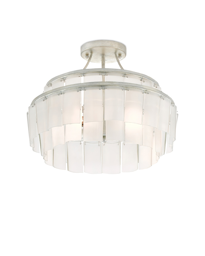 Each row of the Vintner Blanc Semi-Flush is made up of individually-cut pieces of frosted glass made from recycled bottles. The texture of the frosted surfaces beautifully complements the silver leaf finish on the wrought iron frame. This silver flush mount is one of several lights in the Vintner family.