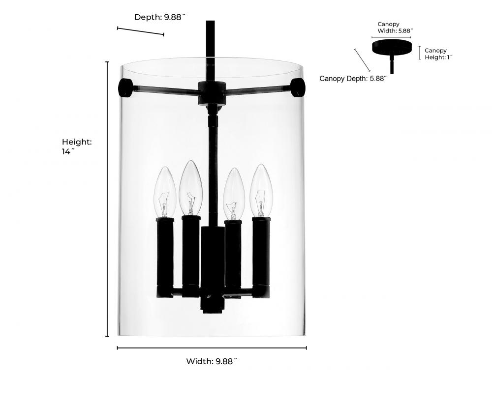 The Vissi Family of pendant lighting sets a distinct tone with classically tailored hardware finished in elegant matte black. The fixtures feature 4 candle-style lights dramatically suspended within the clear, frameless, floating glass shade for a minimalistic take on traditional design. The overall effect provides the perfect lighting solution for dining areas and entryways.