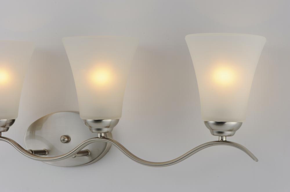 Gently waving arms of Satin Nickel or Oil Rubbed Bronze support tall-profile Frosted glass shades creating a scale normally not found in this category of lighting. The bath vanity may be installed up or down and also includes a Polished Chrome finish.