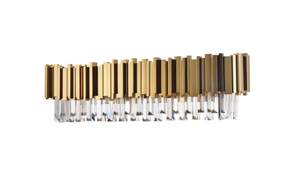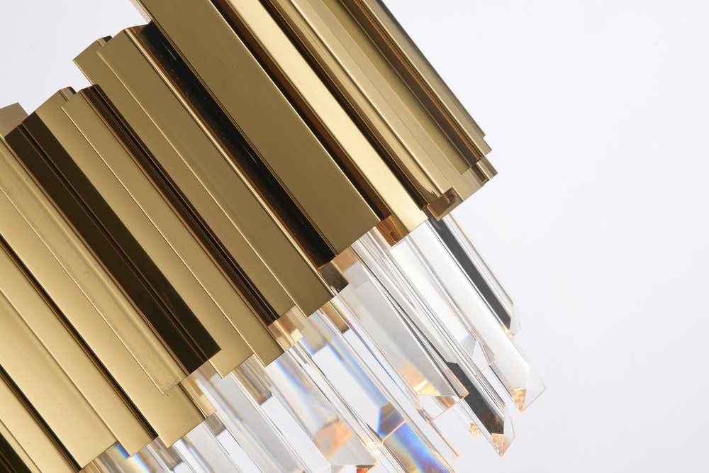 This exquisite wall sconce is in a gold finish. The frame is made out of stainless steel, and it comes with crystal accents in clear color. This wall sconce can be used in modern vanities, hallways, and more.