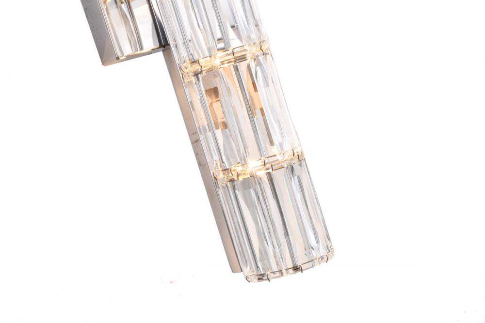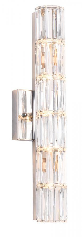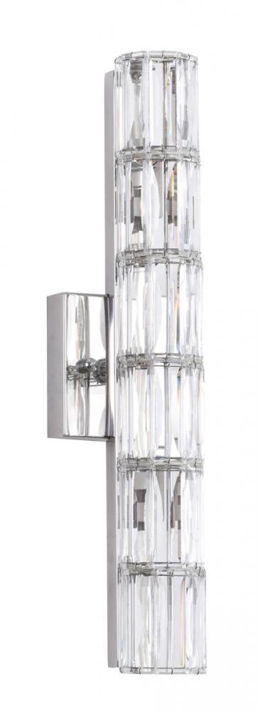 This exquisite wall sconce is in a chrome finish. The frame is made out of metal, and it comes with clear crystal cylinder. It can be mounted horizontally or vertically, and it also can be used in bathroom.