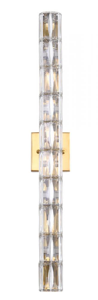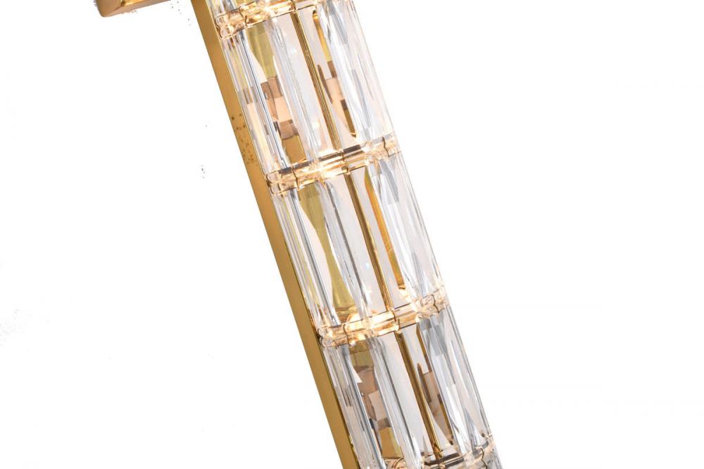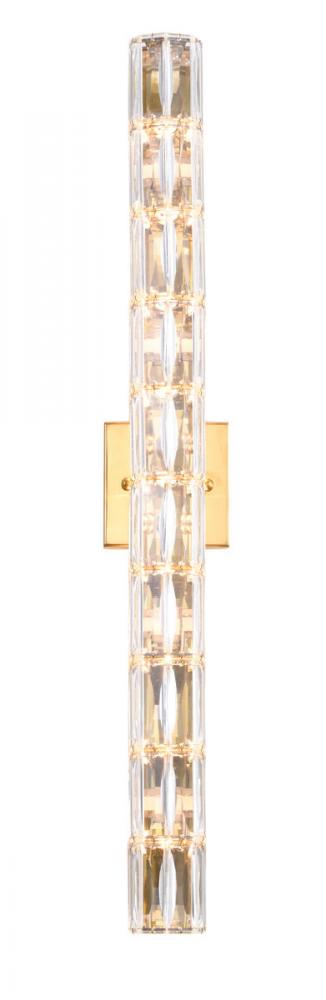 This exquisite wall sconce is in a gold finish. The frame is made out of metal, and it comes with clear crystal cylinder. It can be mounted horizontally or vertically, and it also can be used in bathroom.