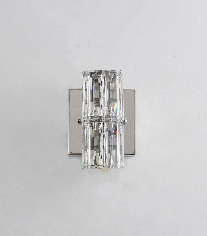 This exquisite wall sconce is in a chrome finish. The frame is made out of metal, and it comes with clear crystal accents. It can be used in any rooms, entryways, and more, and can be mounted horizontally or vertically.