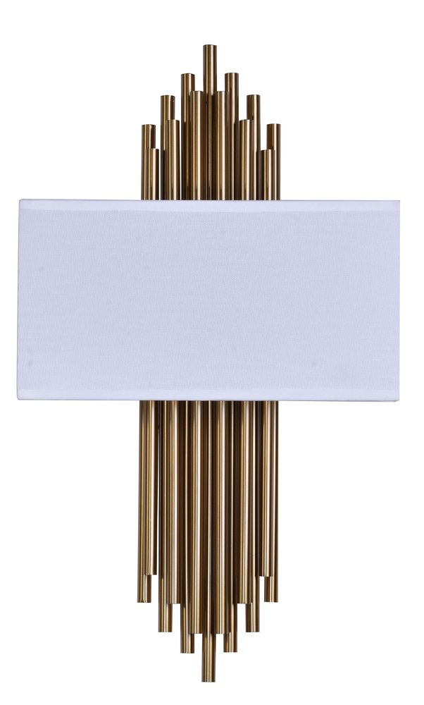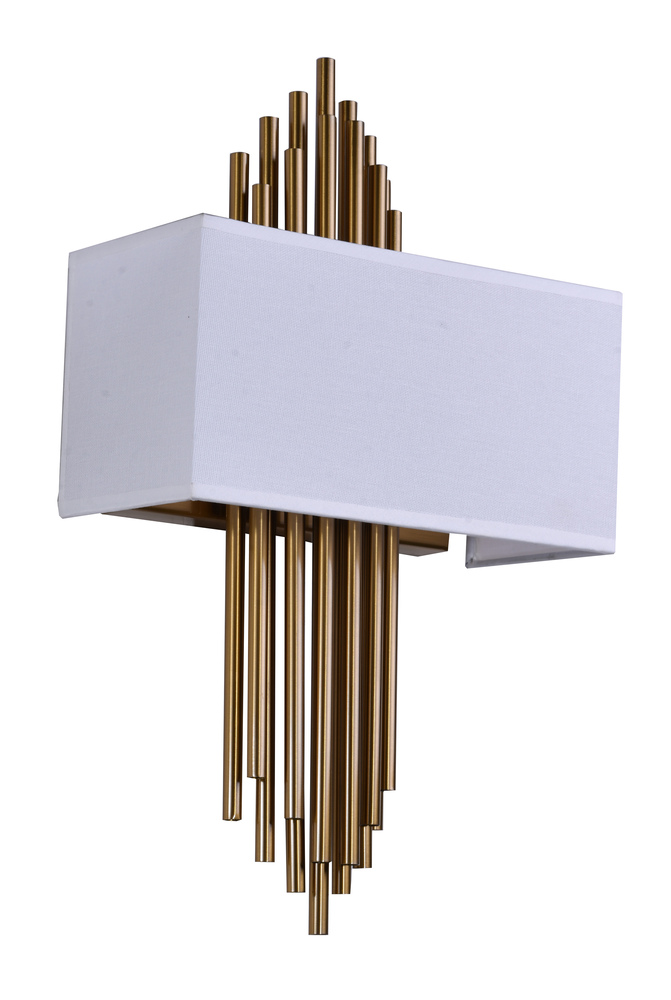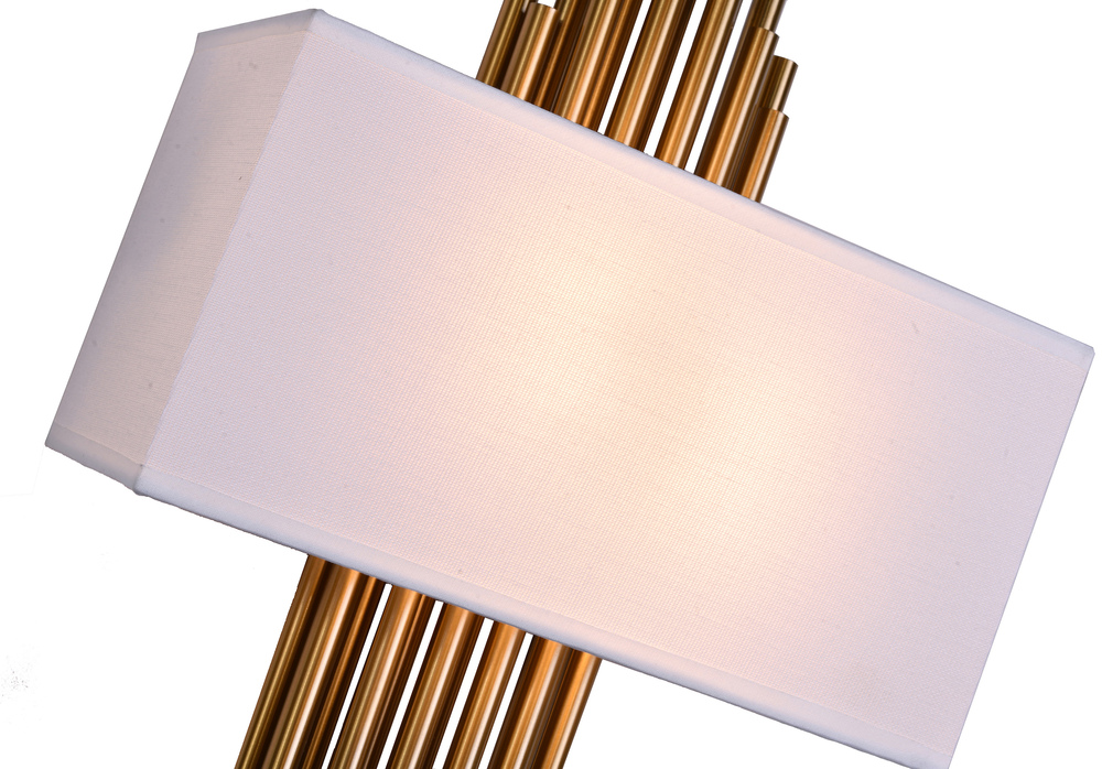 This wall sconce is in a gold finish. The frame is made out of metal, and it comes with gold metal rods and a white fabric shade. It can be used in any rooms, entryways, and more.