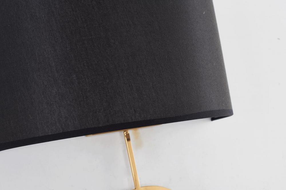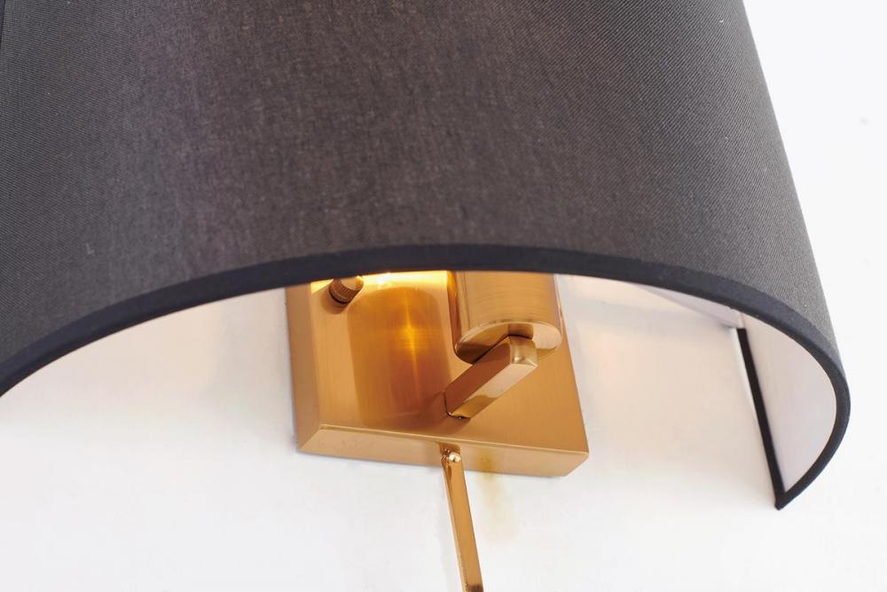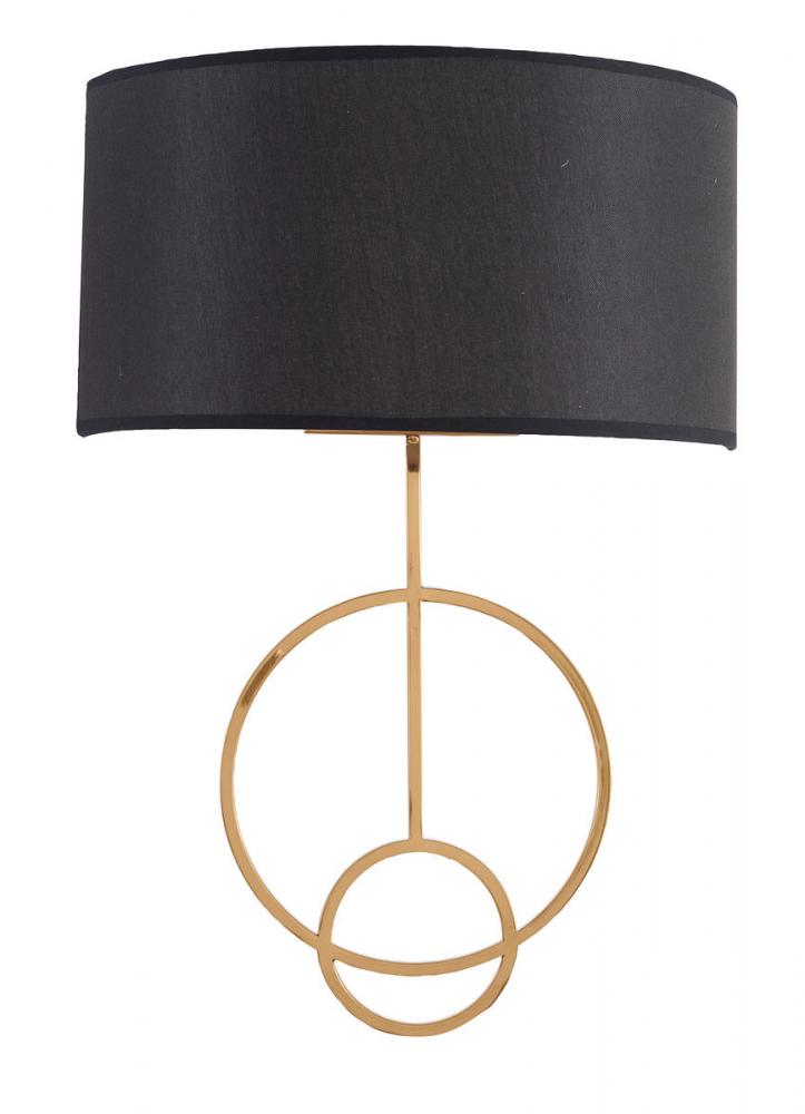 This exquisite wall sconce is in a satin brass finish. The frame is made out of metal with two metal rings. It also comes with a black fabric shade. It can be used in any rooms, entryways, and more