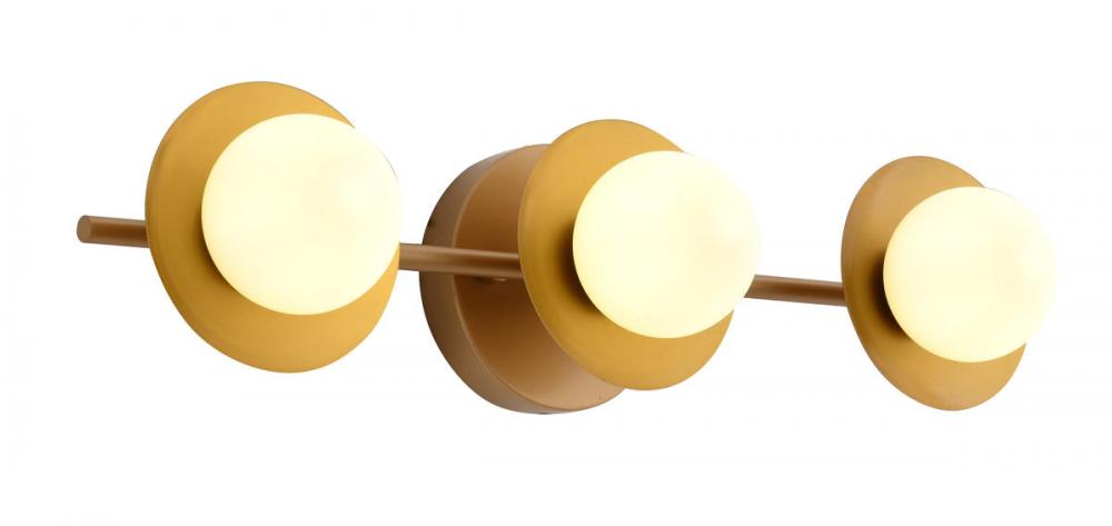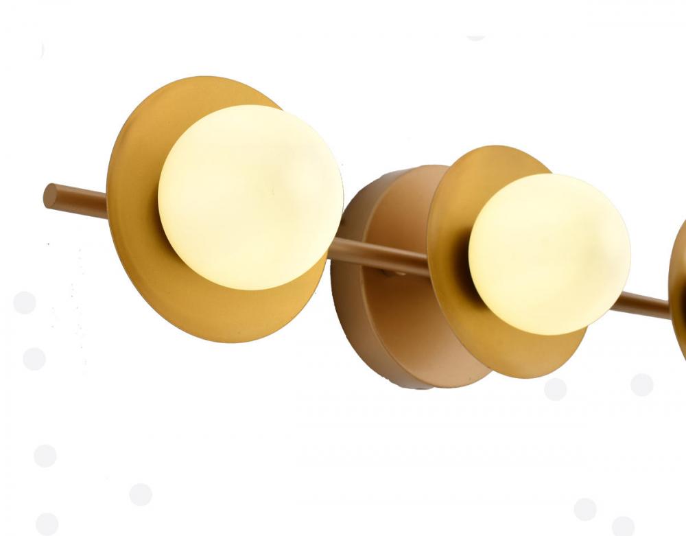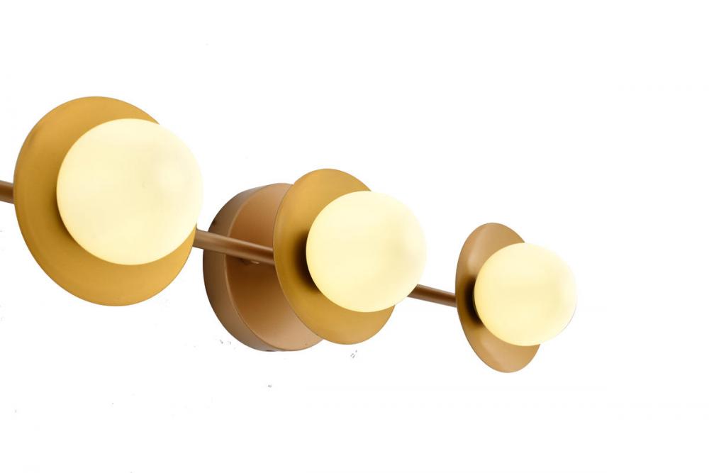 This exquisite wall sconce is in a brass finish. The frame is made out of metal, and it comes with white glass shades. It can be used in any rooms, entryways, and bathroom.