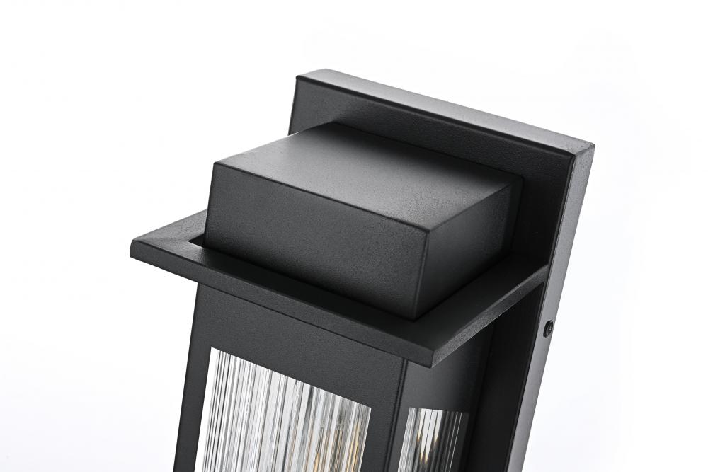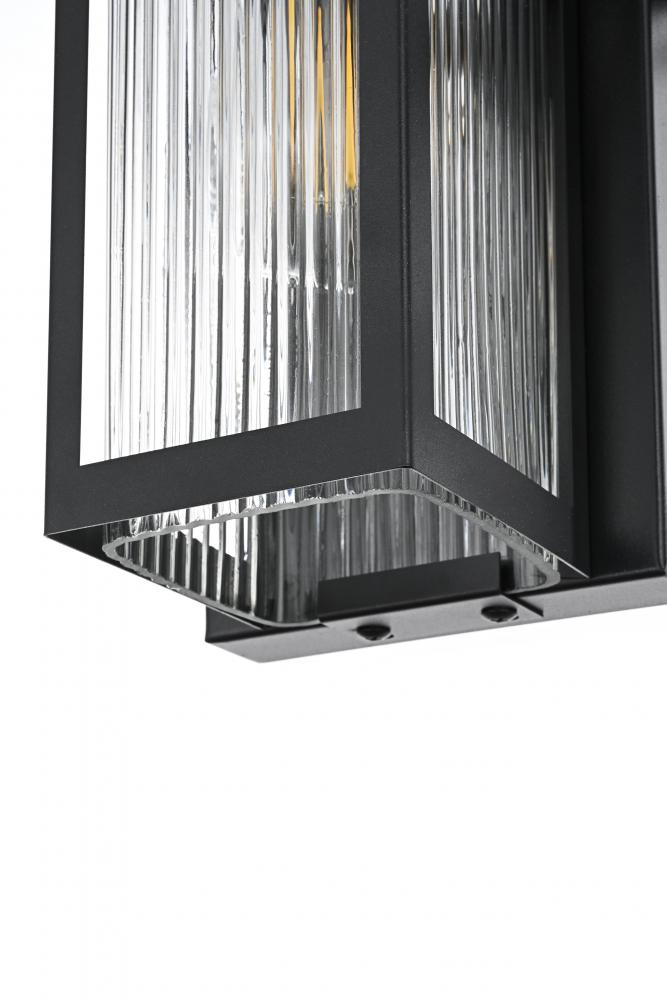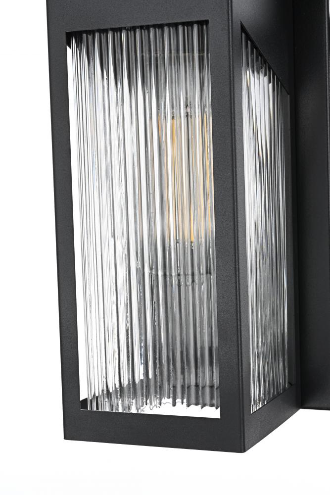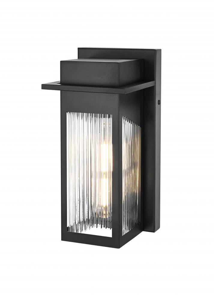 Bring a refined touch to your outdoor spaces with this modern wall sconce, thoughtfully designed to enhance any exterior setting. Constructed from robust iron, this wall sconce features a unique combination of fluted glass that culminates in a sophisticated metal ring trim, and a structured top composed of thick bold square top. The slim, extended backplate offers clean lines that perfectly complement the architectural elements of the fixture. The E26 socket accommodates various bulb types, letting you create your ideal level of lighting. Whether you want to brighten an entryway or add a decorative touch to a garden path, this sconce merges durability and striking style for an ideal outdoor lighting solution.