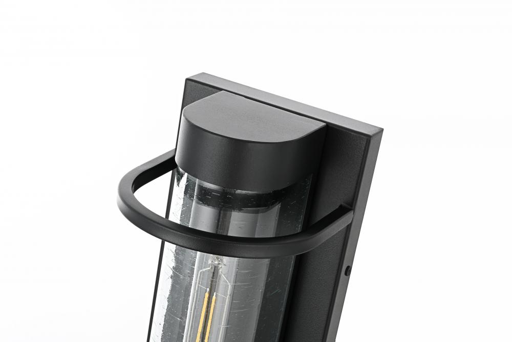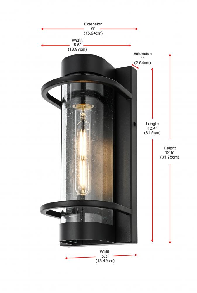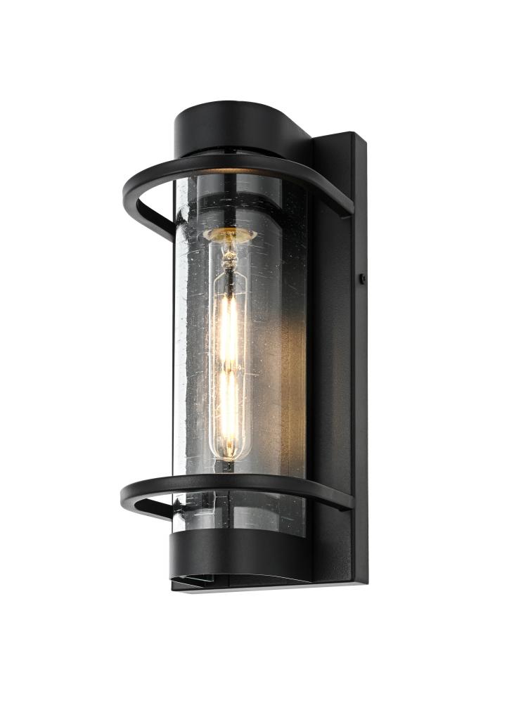Transform your outdoor space with this striking outdoor wall sconce, expertly crafted from durable iron and clear seeded glass to deliver a blend of modern sophistication and timeless appeal. This wall sconce is designed with a bold cylindrical glass shade that wraps around an E26 socket, ensuring it shines with a warm, inviting glow. The distinctive curved metal armature creates a sense of structural harmony while offering a protective yet stylish look. with a sleek black finish, this sconce brings contemporary refinement to your entryways, patios, or garden spaces, all while being engineered to withstand the elements. Elevate your home's curb appeal and bask in the timeless allure of this refined lighting piece.