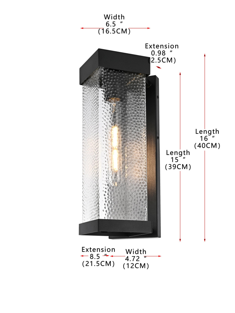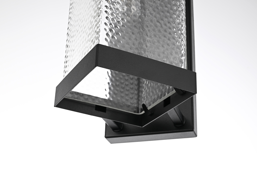 Bring a refined touch to your exterior spaces with this stunning outdoor wall sconce. The design features a black iron frame with a tall rectangular silhouette, providing a timeless and bold statement. The textured, rippled glass panel emits a diffused and inviting light, creating a beautiful ambient glow. The E26 socket offers compatibility with a range of light bulb types, including energy-efficient LED options, while the rugged iron construction ensures durability against the elements. The sconce’s structured aesthetic, topped and bottomed with iron frames, embodies both strength and sophistication, making it ideal for doorways, patios, or walkway