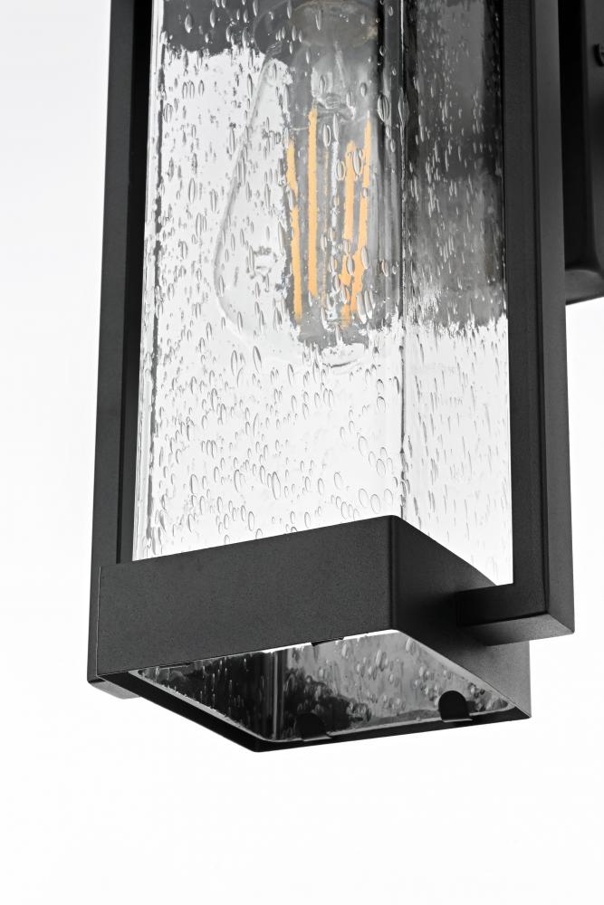Transform your outdoor space with this striking iron and glass wall sconce, where classic design meets modern functionality. Crafted from durable iron, this sconce exudes a sturdy and timeless appeal, while the textured glass panes add visual depth, creating a glowing ambiance perfect for any exterior setting. The light fixture beautifully combines clean lines and soft accents, making it ideal for both traditional and modern homes. Its rugged black finish complements various decor styles, while the seeded glass subtly diffuses the light, delivering a warm and inviting glow that enhances curb appeal and nighttime visibility. Designed with durability in mind, this sconce is built to withstand the elements, making it a perfect lighting solution for patios, entryways, and gardens.