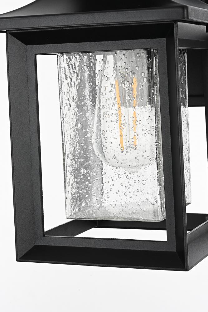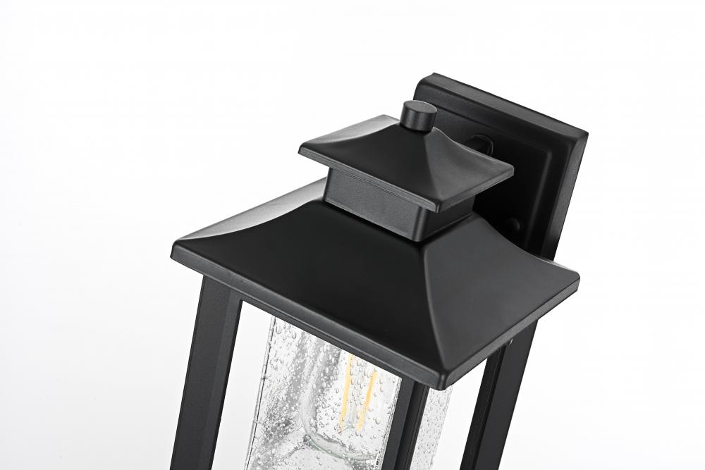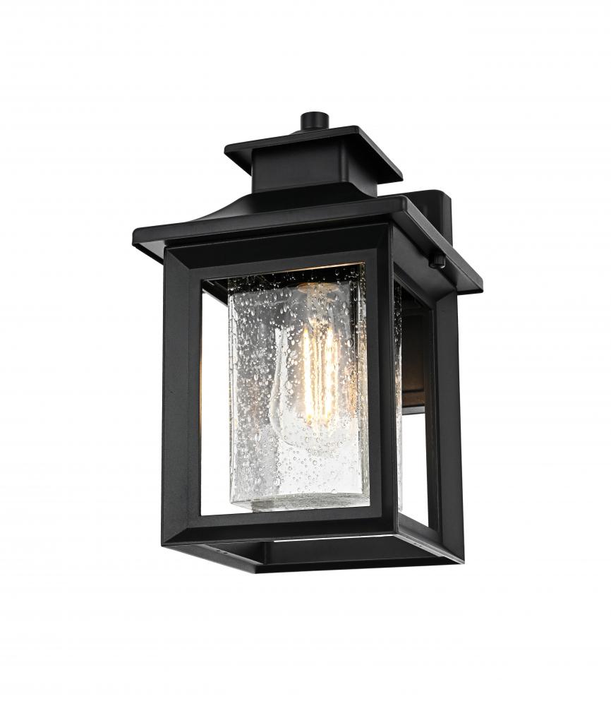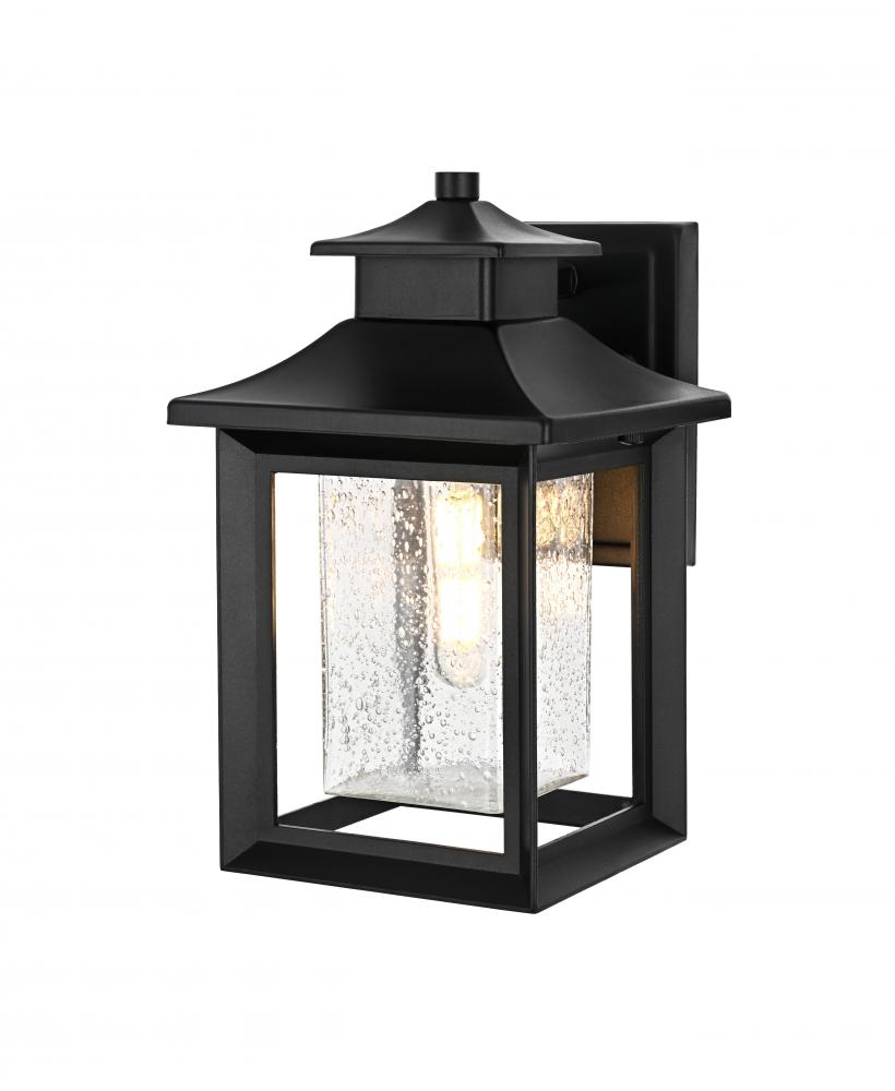 This outdoor wall sconce blends sturdy construction with a clean and crisp design, making it perfect for enhancing the ambiance of your porch, patio, or entryway. Constructed from durable aluminum with a striking black finish, the lantern features a rectangular frame with a subtly pitched roof that provides a modern yet timeless touch. The sconce's clean lines are contrasted by the textured, clear seeded glass, which softly diffuses light to create an inviting glow. The E26 socket base allows you to choose from a wide variety of bulb styles to further personalize the fixture, making it versatile for various decor styles. This fixture is as functional as it is stylish, providing a perfect balance of form and purpose to brighten your outdoor spaces.