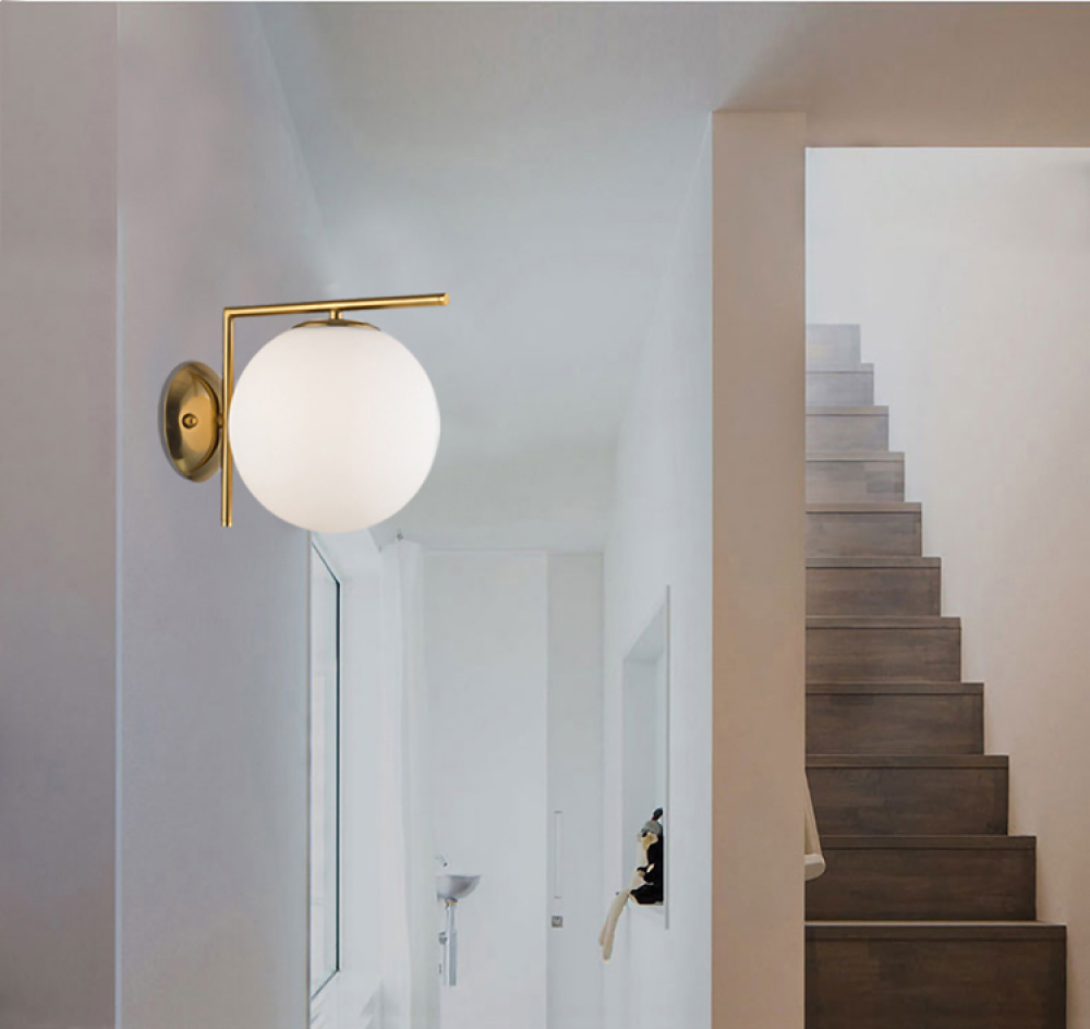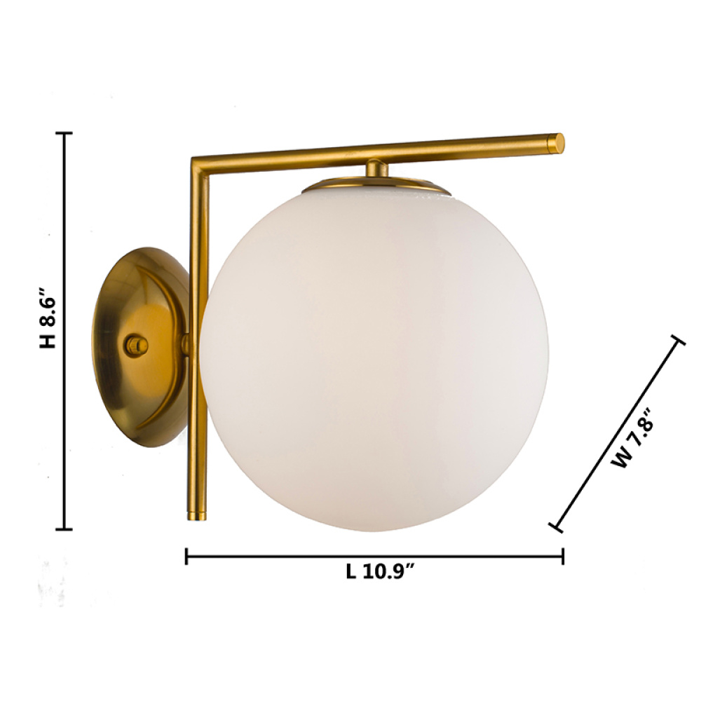 This modern wall sconce has a brass iron frame. It comes with a glass shade in milk white color. This exquisite wall sconce can be used in modern vanities, hallways, and more.