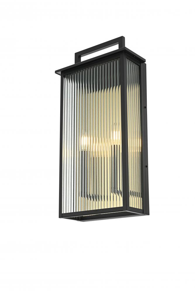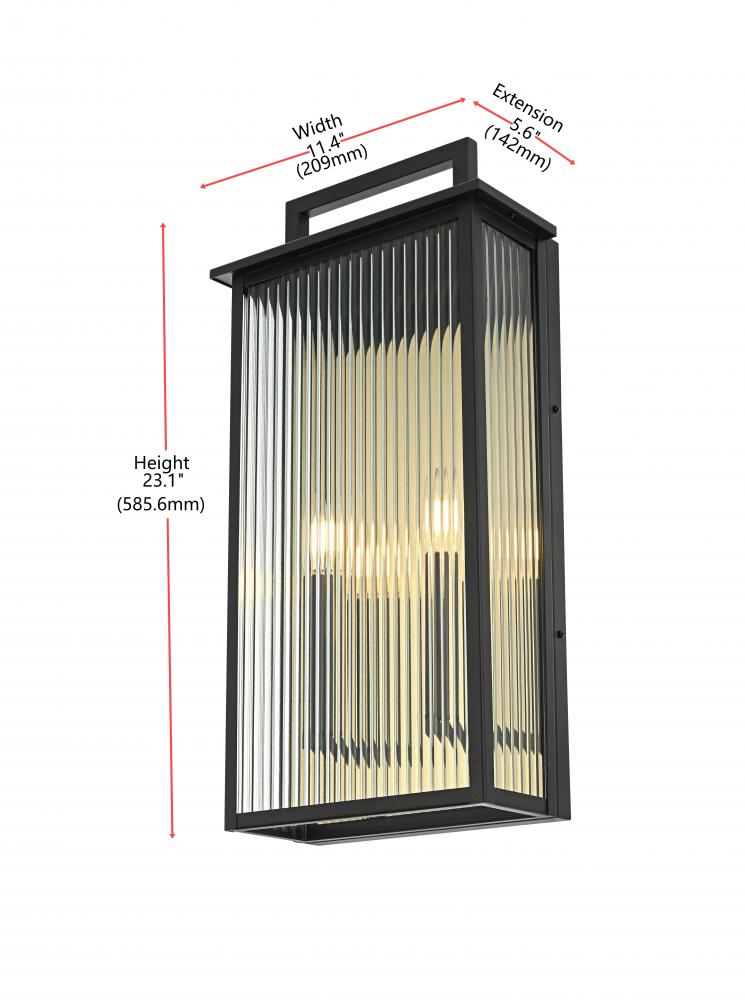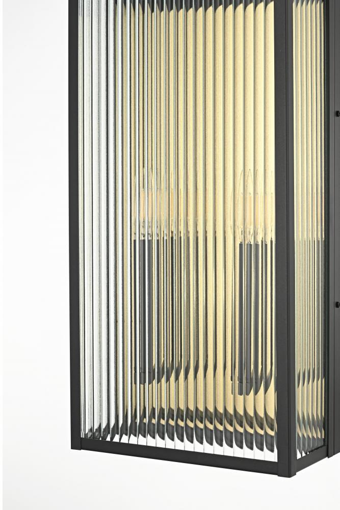 Transform your outdoor space with this stunning wall light that pairs durability with striking design. The sleek iron frame is complemented by vertically ribbed glass panels, creating a unique interplay of light and shadow. The standout feature? A gold backplate that adds a luxurious touch, reflecting a warm glow and contrasting beautifully with the matte black frame. with multiple candelabra-style bulbs and weather-resistant construction, this fixture is not only functional but a true visual centerpiece for entryways, patios, or pathways. Make a statement with this captivating combination of modern design and radiant metallic accents.