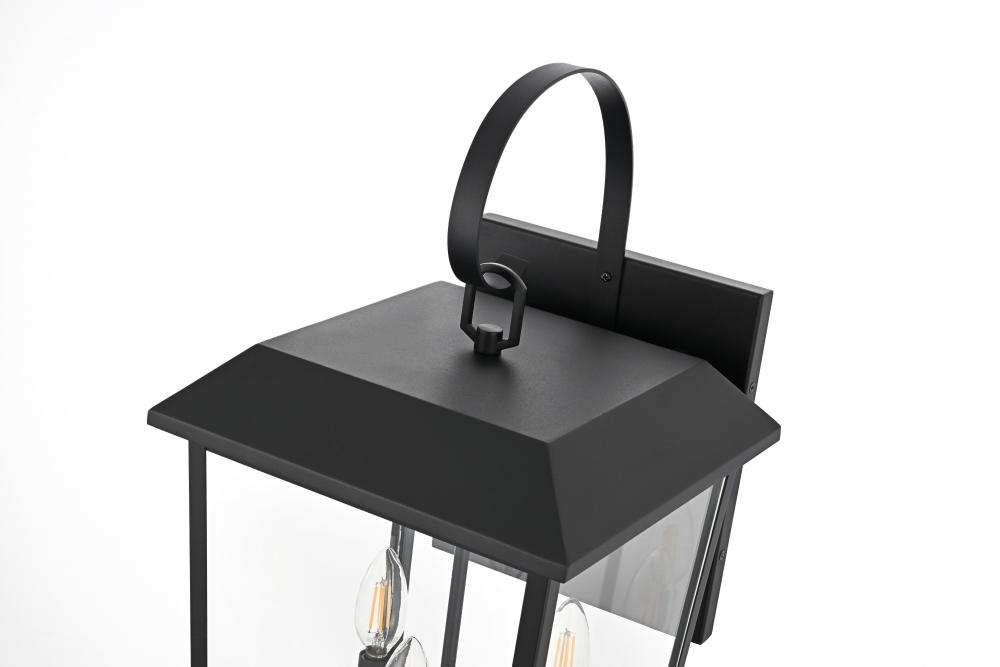 Enhance your home’s curb appeal with this striking outdoor wall sconce. Crafted from sturdy iron and framed with crystal-clear glass, this sconce embodies a bold rectangular lantern design that radiates classic charm. with three candelabra-style bulbs, it casts a warm, inviting glow, beautifully amplified by the clear glass panels. The matte black finish and curved arm detail add a touch of architectural refinement, while its weather-resistant design ensures lasting beauty. Perfect for entrances, patios, or walkways, this sconce lights the way in style.