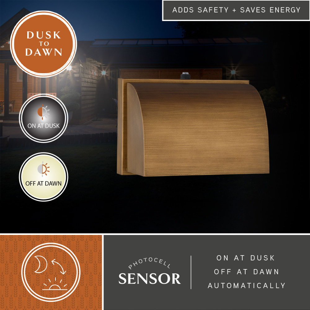 Achieve a sleek, modern look with the Walsh outdoor wall light. Its minimalist, rectangular design and hooded shade provide a discreet yet stylish way to illuminate your home's exterior. The warm brass finish and clean, rectangular silhouette capture the essence of iconic mid-century modern style. Dark sky compliance minimizes upward glare, preventing light pollution making it a logical solution to eco-conscious home owners. A dusk to dawn photo cell automatically turns the fixture on in the dark and off in the light for added safety and security, saving energy during daylight hours. Perfect for illuminating entryways, patios, or garage areas, along with bathrooms, hallways, stairways, and foyers.