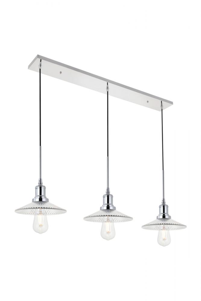 Chrome finish 3-light pendant light and short cone shaped shade hanging from a rectangular canopy