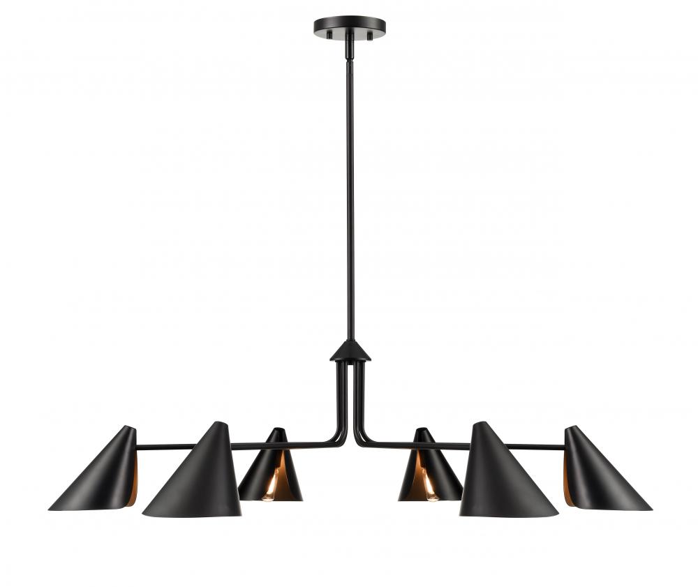 Dynamic design and crisp lines give the Warhol Collection of chandeliers a look of distinction that will become a striking focal point for any room. The fixtures are finished in matte black and are available in either 4-light or 6-light options. The mid-century shades fold open towards the fixture's center and are completed with a gold interior, providing a warm and intimate light.