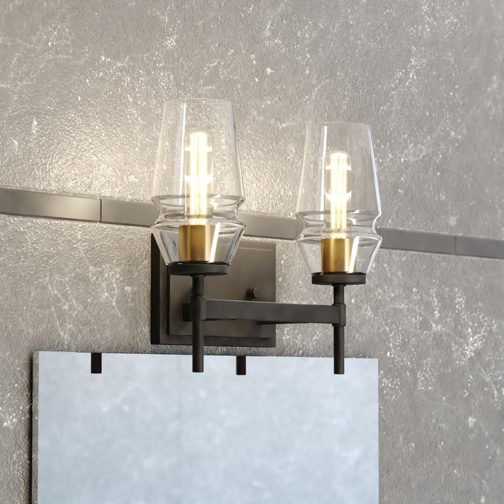 A throwback to mid century modern decor is perfectly represented in the Warren collection. Slightly tapered clear glass shades are evenly spaced along a sleek metal bar. Vertical supports in matte black gives this collection its charm. Memories of years gone by are brought back to life with the brushed brass accents of the Warren collection. Add this vanity wall light to any bath for an on-trend update.