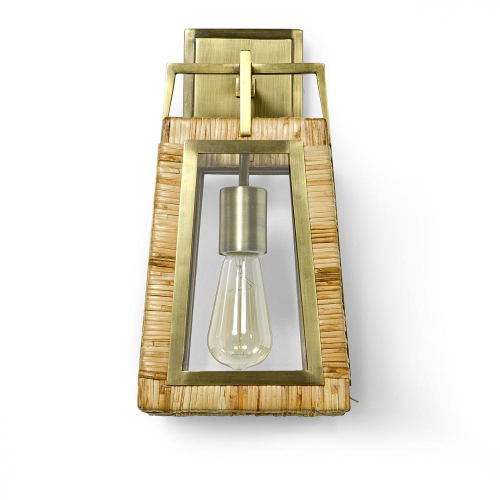 Sconce features natural split rattan hand-wrapped over a wood frame accented with antique brass finished metal trim and glass panels. Sconce is complete with an antique brass finished metal backplate. Professional installation is recommended.